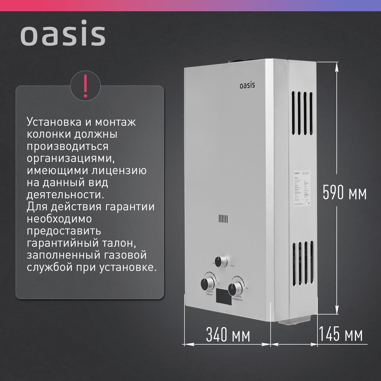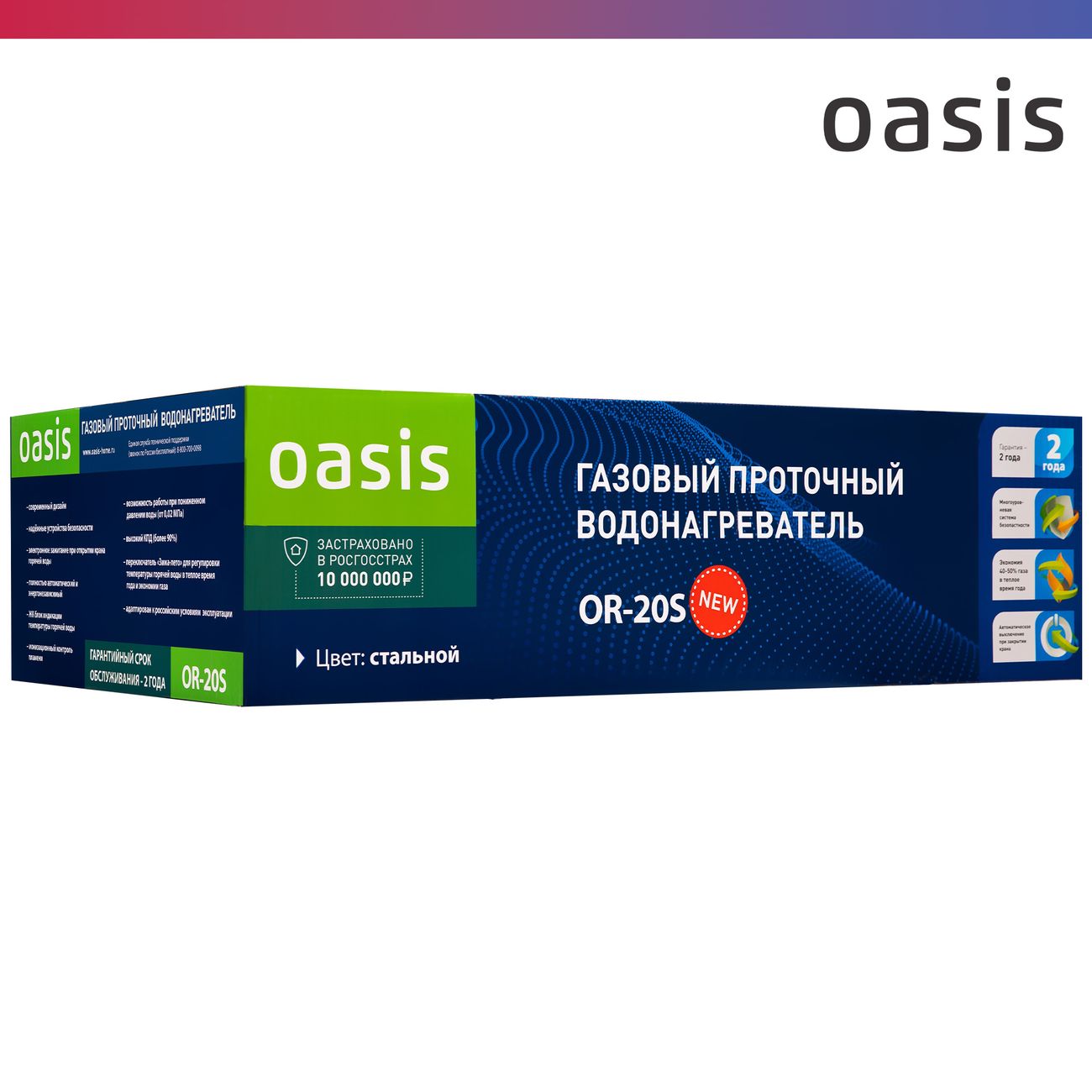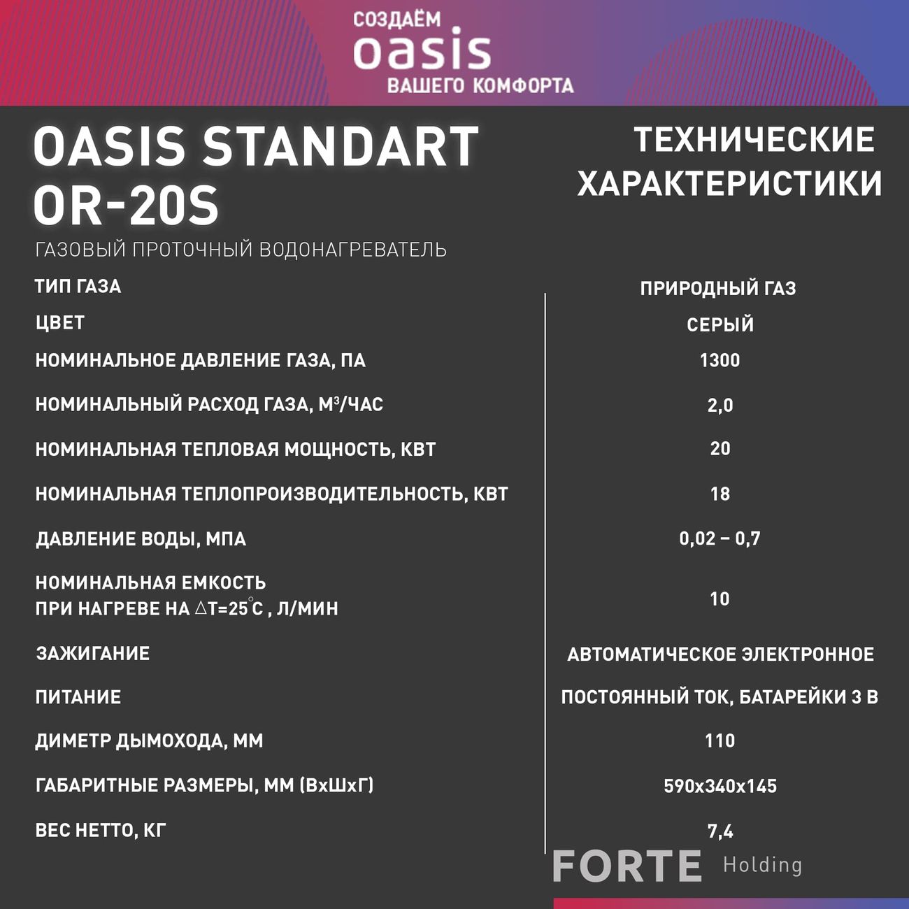 Газовый проточный водонагреватель Oasis OR-20S — решение для организации ГВС в домах без централизованного горячего водоснабжения. Мощность 20 кВт обеспечивает подачу до 10 л/мин нагретой воды, подходит для квартир и коттеджей с дымоходной системой.
