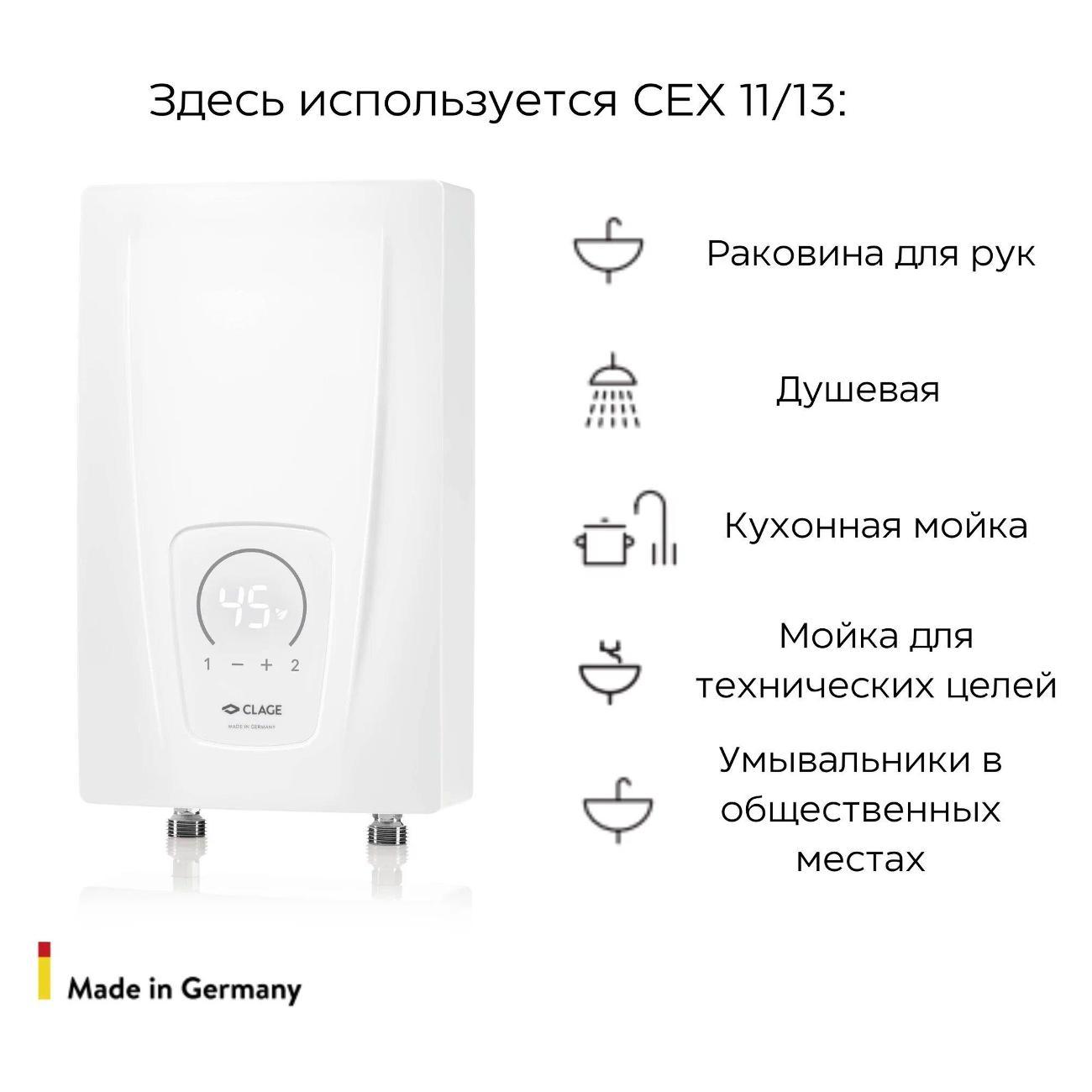 Проточный водонагреватель CLAGE CEX 11/13 E-compact – идеальный вариант для установки в офисах, саунах, салонах красоты, квартирах, в том числе на период отключения горячей воды – там, где есть возможность подключения ~380/400В. Прибор отвечает всем требованиям безопасности. Корпус прибора защищен от попадания на него брызг и струй воды (IP 25), что позволяет разместить его непосредственно в зоне принятия душа.