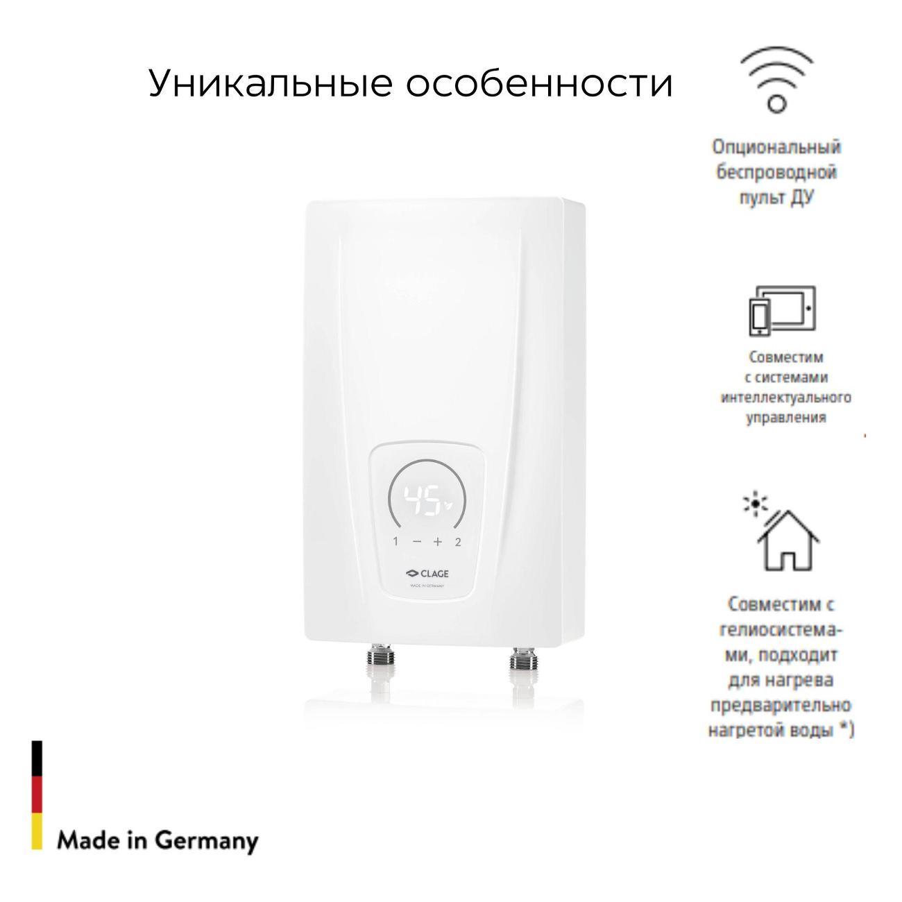 Электрический проточный водонагреватель CLAGE CEX 11/13 E-compact с выбором мощности 11 кВт или 13,5 кВт для трехфазной сети ~380В. Производство Германия. Электронный модуль автоматически поддерживает стабильную температуру на выходе в диапазоне +20°C...+60°C. Прибор оборудован ЖК-дисплеем и имеет простое, понятное управление. В комплекте с прибором идет две инструкции: для пользователя и специалиста, в инструкции для специалиста есть шаблон для быстрого монтажа.