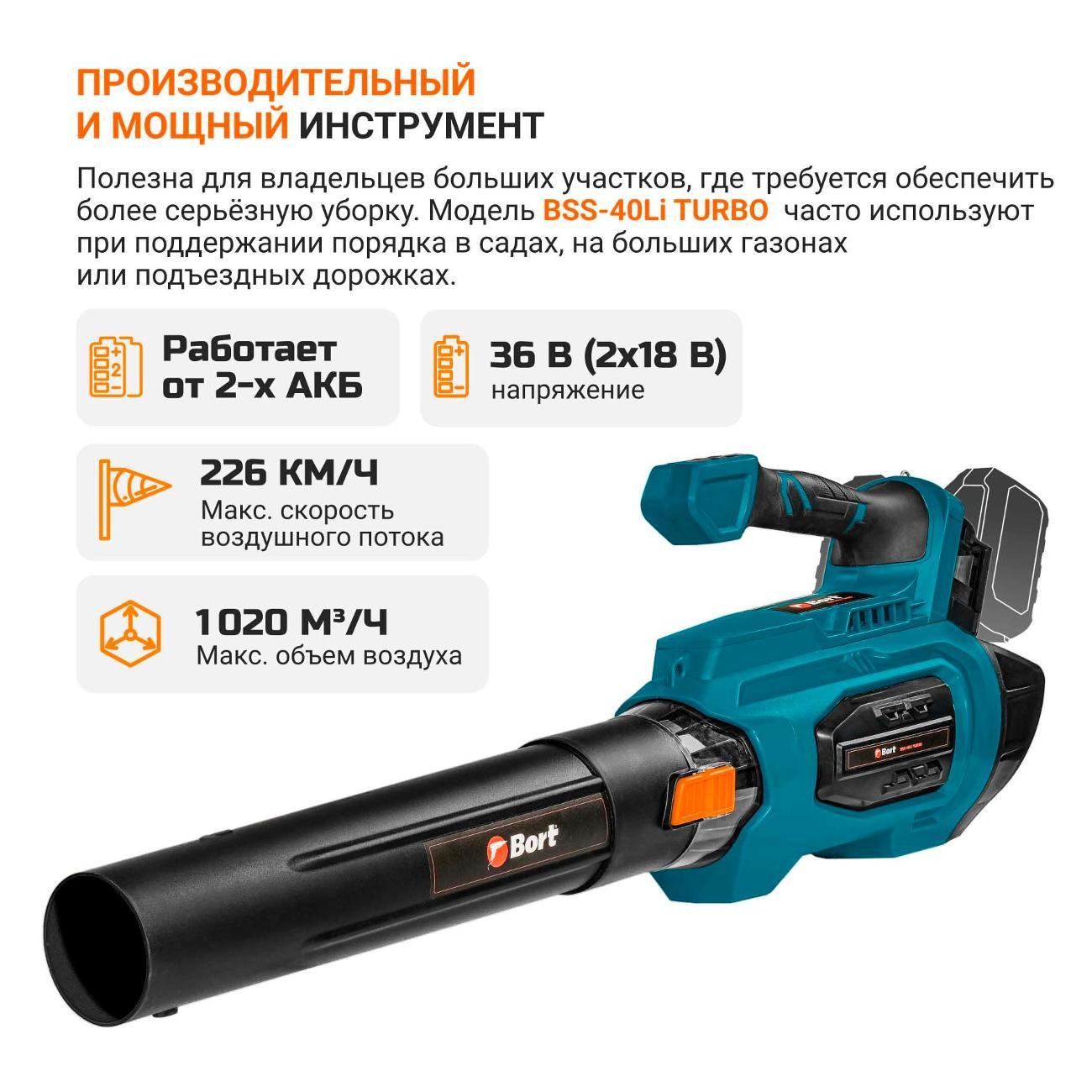 Вы можете купить Воздуходувка аккумуляторная Bort BSS-40LI TURBO в магазинах М.Видео по доступной цене. Воздуходувка аккумуляторная Bort BSS-40LI TURBO: подробное описание, фото и отзывы реальных покупателей, характеристики, возможность скачать инструкции и подобрать аксессуары.