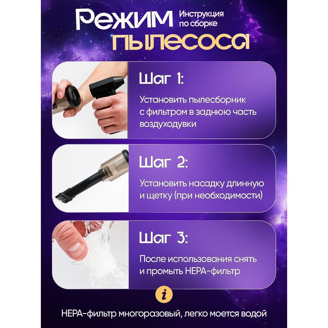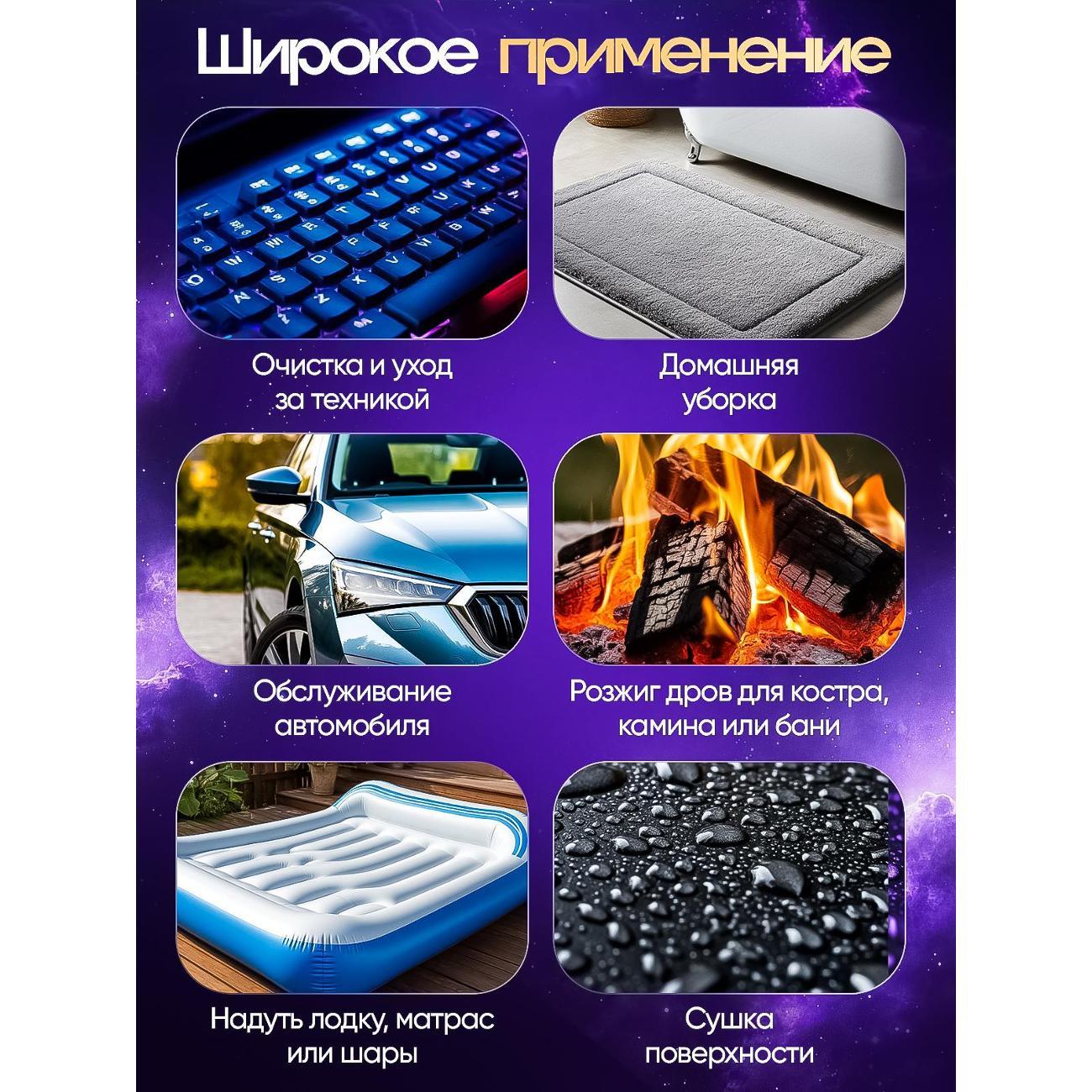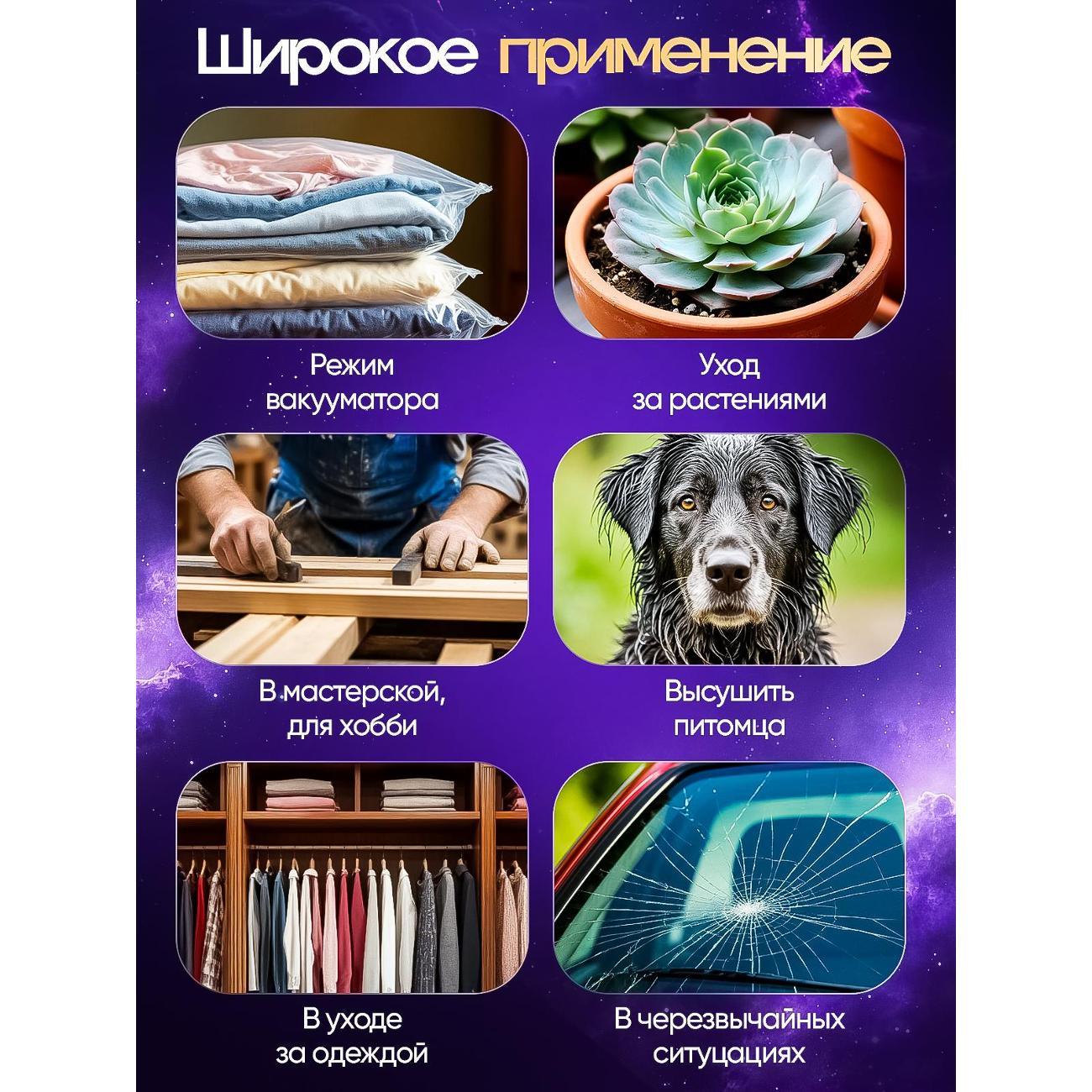 Пользуюсь в машине как пылесосом и на обдув стёкол после автомойки. Классная