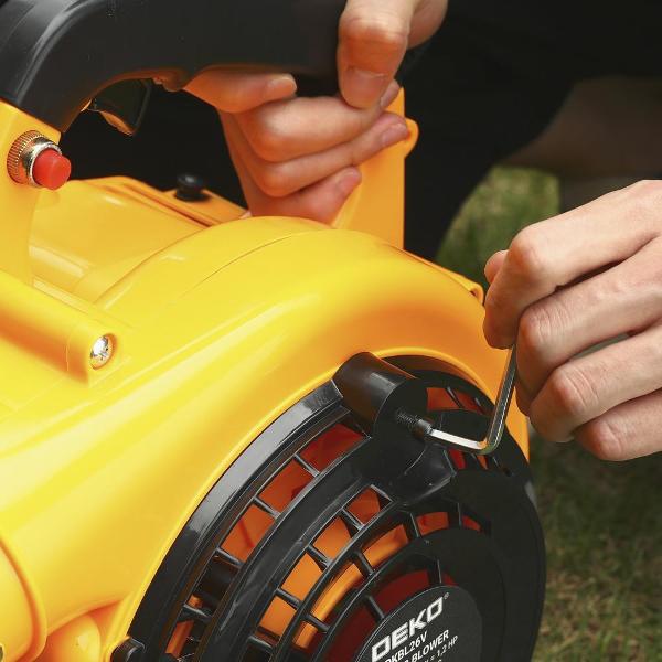 Воздуходувка DEKO DKBL26V предназначена для уборки листвы и мусора на участках с различной поверхностью. Работает от двухтактного бензинового двигателя мощностью 880 Вт (1,2 л.с.). Максимальная скорость воздушного потока — 288 км/ч. Объем воздушного потока — 750 м³/ч. Наличие функции «легкий старт» запуск устройства. Воздуходувка оснащена регулируемой системой выдува, всасывания и измельчения, что позволяет эффективно очистить территорию от мусора. Объем топливного бака — 1,2 л. Объем мусорозборника — 2 л. Пластиковый корпус. Габаритные размеры 29x35,5x56 см, вес — 5,5 кг. Цвет корпуса — черный/желтый. Страна-производитель — Китай. Гарантия один год.