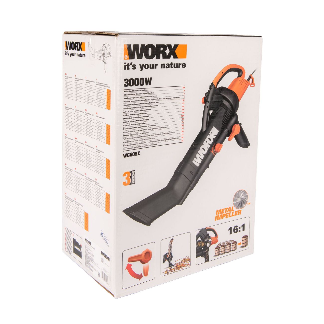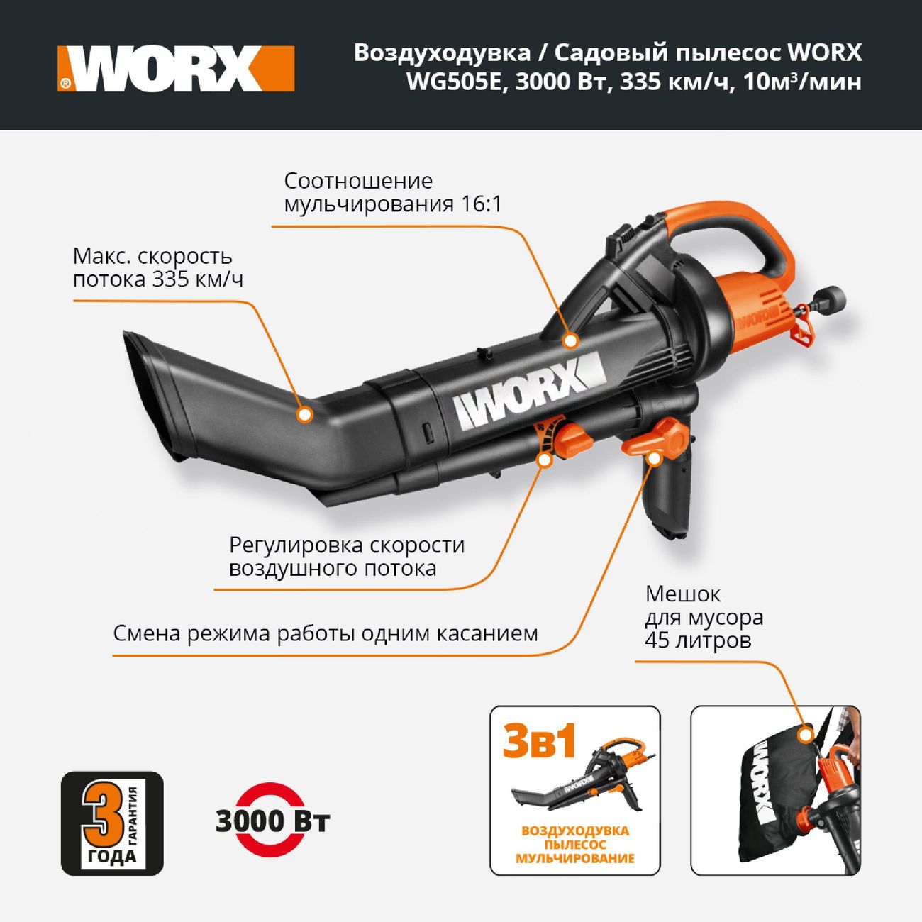 Worx WG505E — воздуходувка с функциями садового пылесоса и устройства для мульчирования. Она весит 4,1 кг и благодаря эргономичной рукояти подходит для работы одной рукой. Модель оснащена двигателем щеточного типа.
