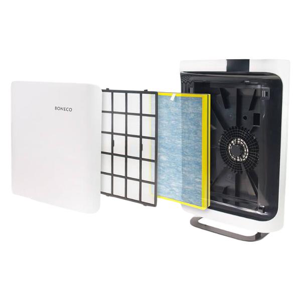 Воздухоочиститель Boneco P500 рассчитан на напольное или настольное размещение и эффективен на площади до 28 м². Модель оснащена системой фильтров, улавливающих пыль, бактерии и аллергены и нейтрализующих табачный дым. Производительность — до 300 м³/час. Уровень шума во время работы не превышает 25 дБ. В прибор встроены ионизатор и вентилятор, предусмотрен отсек для ароматизации.