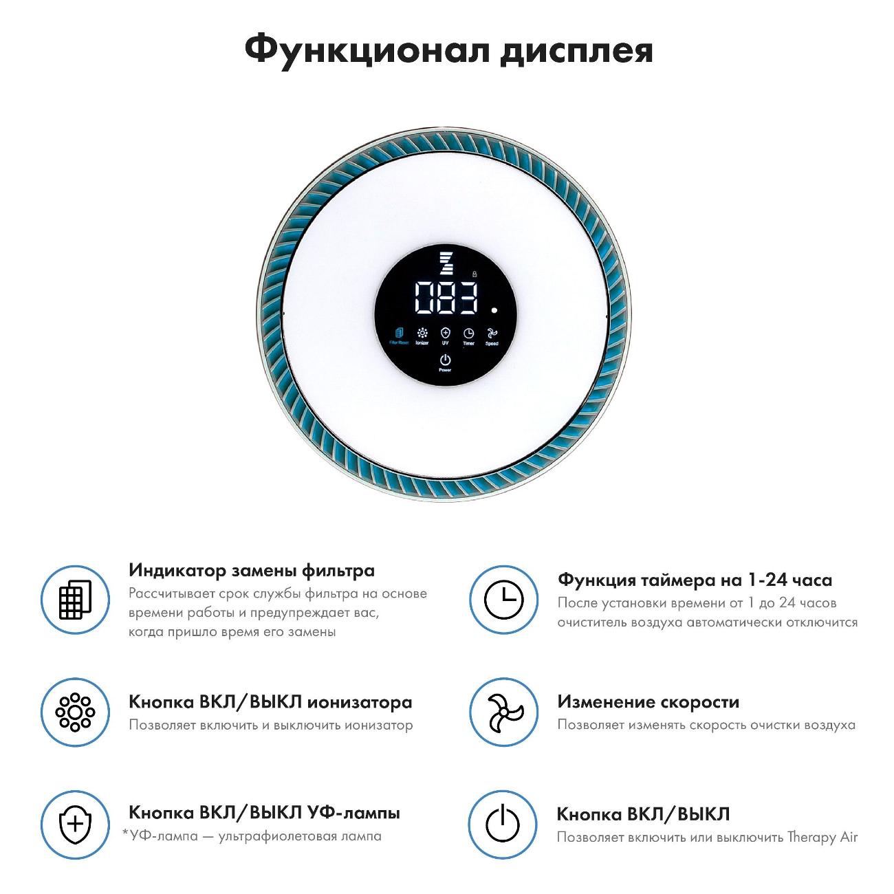 Функция «Ионизация» позволяет очищать воздух от загрязнений. В процессе работы может осуществляться нейтрализация табачного дыма. Индикаторы показывают включение, выбранную мощность, загрязнение воздуха, фильтра. По окончании работы срабатывает звуковой сигнал.