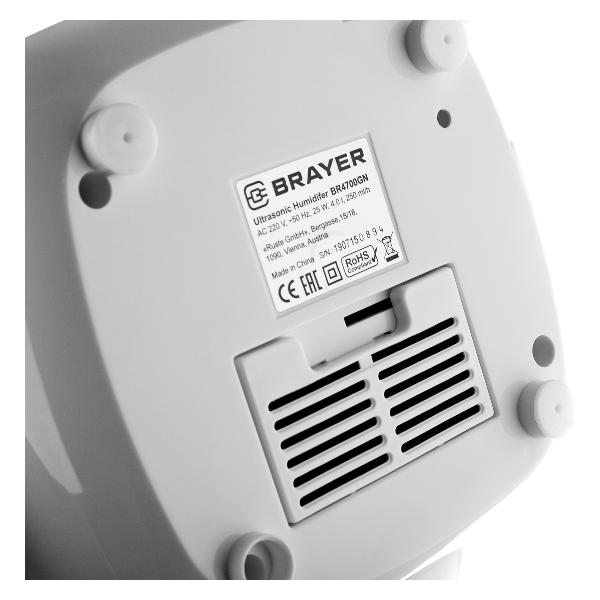 Воздухоувлажнитель Brayer BR4700GN зеленого цвета с мощностью 25 Вт функционирует в течение 11-13 часов без перерыва в максимальном режиме. Резервуара объемом 4 л хватает на это время. Модель оснащена регулятором, позволяющим вращать струю пара на 360°.
