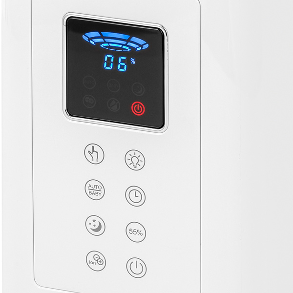 Сенсорное управление наглядно и просто в освоении: каждая кнопка снабжена пиктограммой-подсказкой. На срок от 1 до 12 часов можно установить таймер. Он пригодится, например, если вы захотите освежить помещение перед сном, но предпочтёте, чтобы устройство не работало всю ночь. Все настройки отобразит цифровой дисплей.