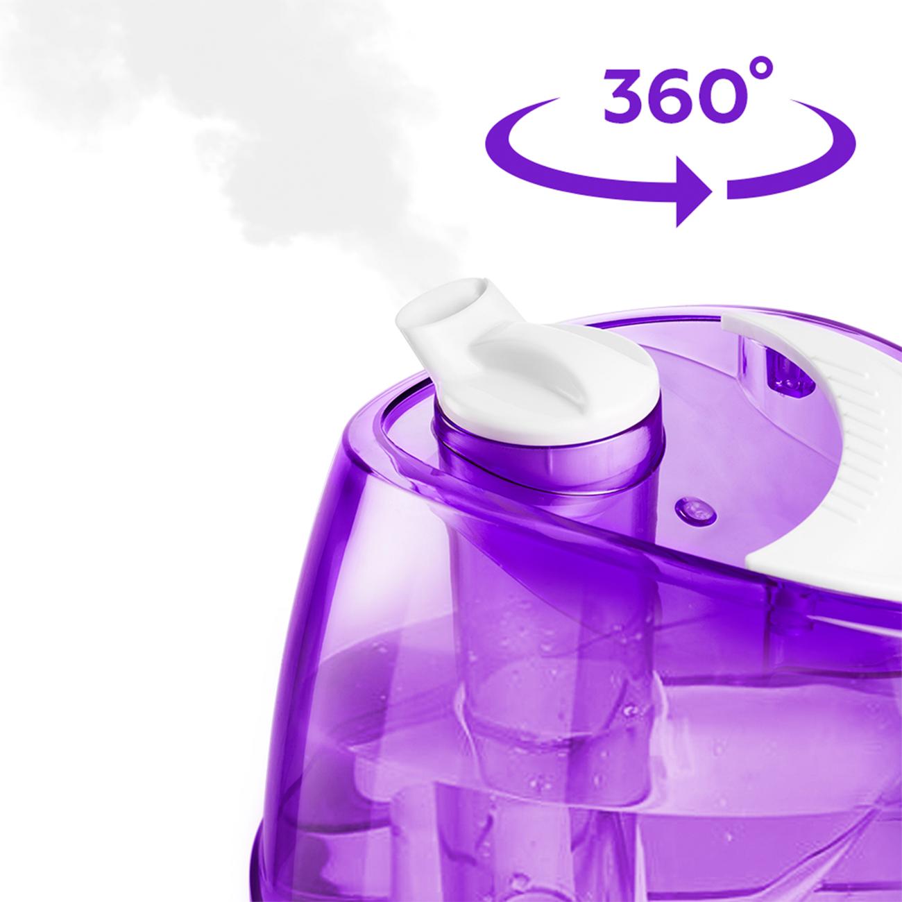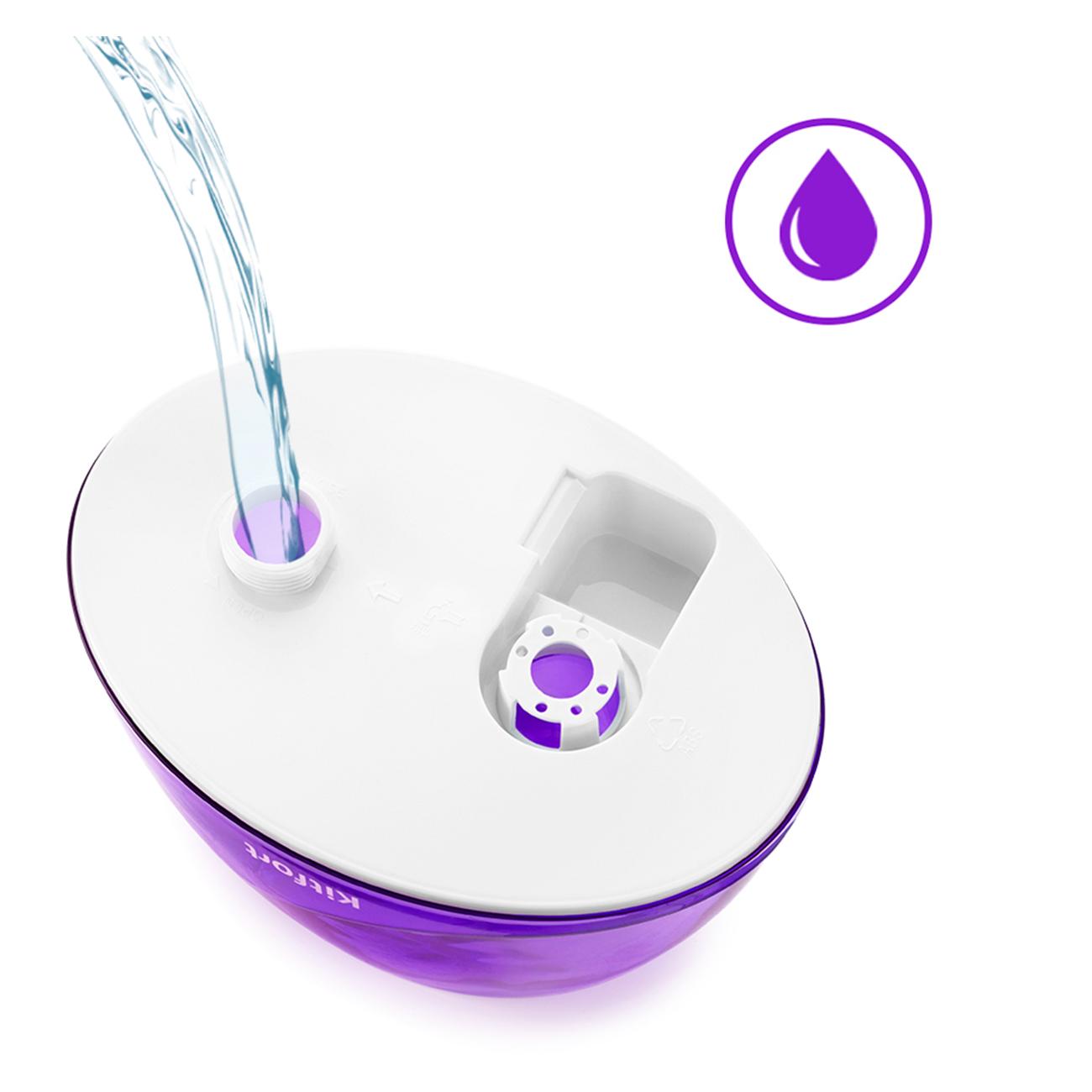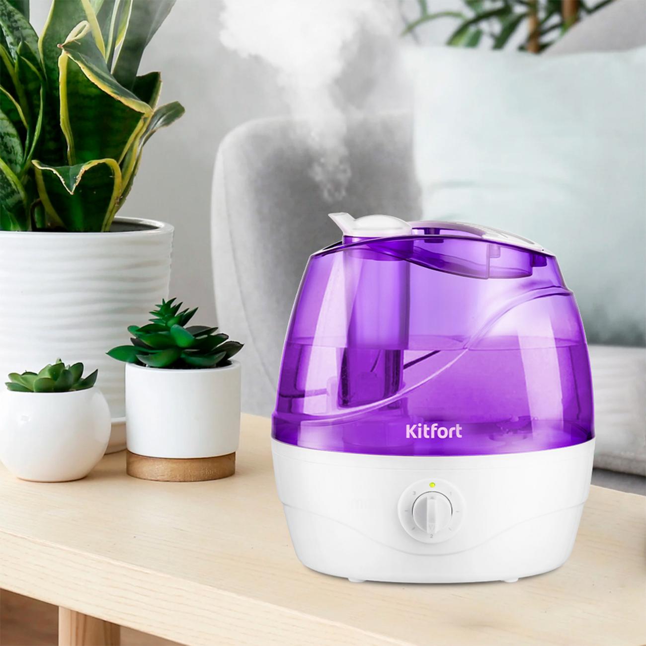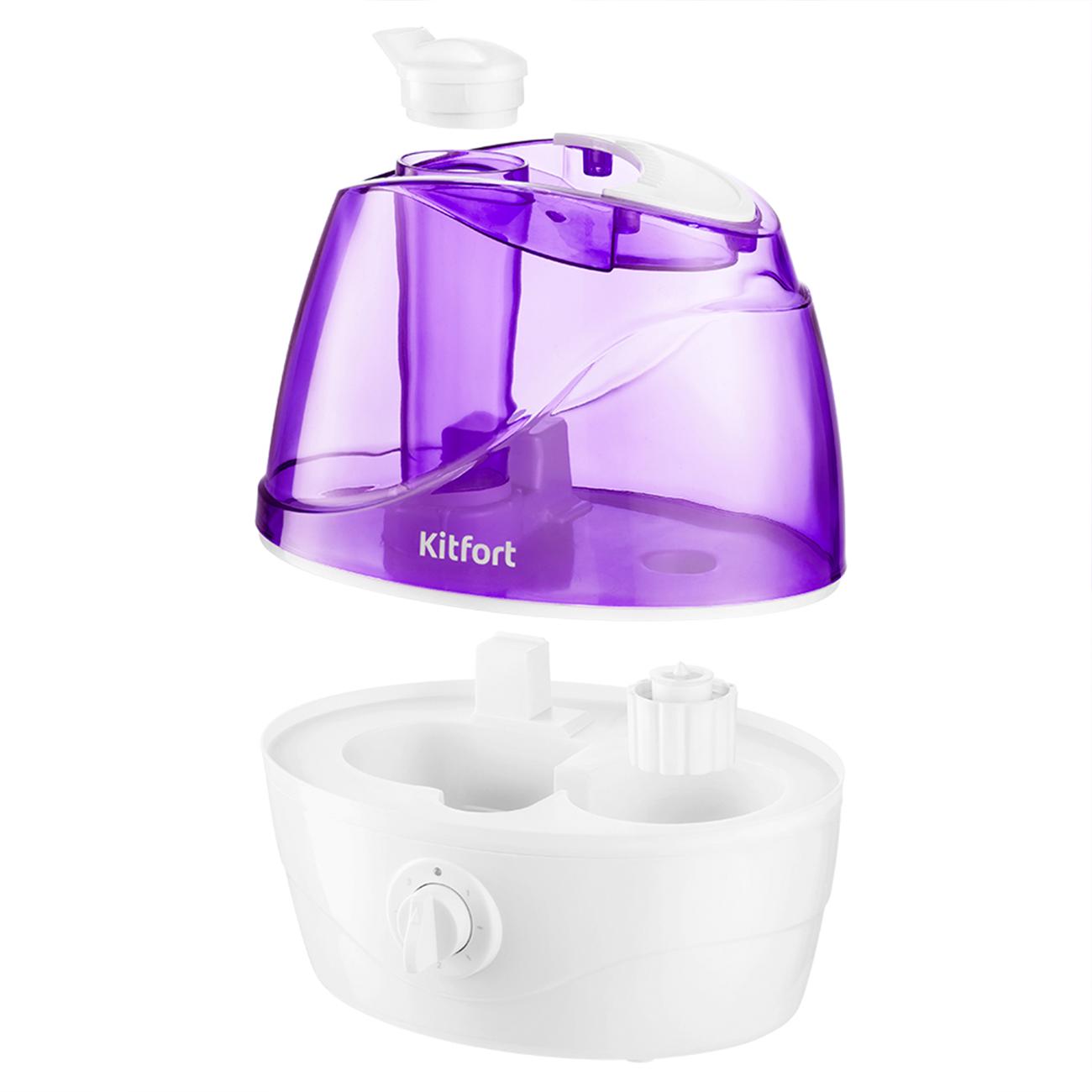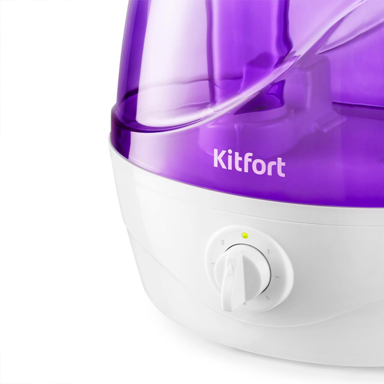 Ультразвуковой воздухоувлажнитель Kitfort КТ-2834-1 бело-фиолетовой расцветки оснащен резервуаром для воды объемом 2,2 л. При окончании воды в резервуаре загорается световой индикатор красного цвета. У прибора механическое управление с поворотным регулятором и световой индикацией включения зеленого цвета. Интенсивность испарения на максимальной мощности достигает 350 мл/ч, время беспрерывной работы — 6 часов. Устройство оснащено поворотным на 360° соплом, которое позволяет точно направить распыляемый туман.