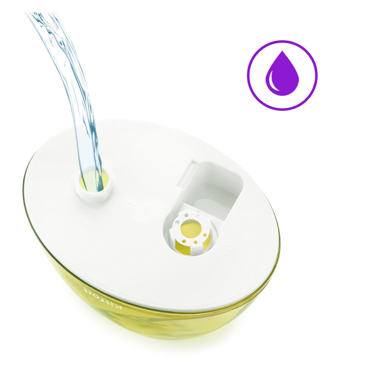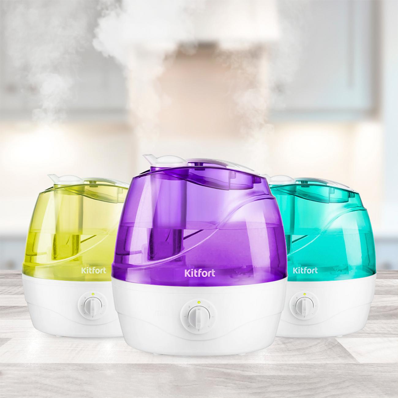 Воздухоувлажнитель Kitfort КТ-2834-2 размером 24,5х21,6х17,6 см весит 0,72 кг и работает от сети 220-240 В, к которой подключается шнуром длиной 1,5 м. Устройство мощностью 32 Вт предназначено для обслуживания помещения площадью до 35 м². Уровень шума не превышает 32 дБ, что дает возможность использовать увлажнитель в любое время суток. Резервуар объемом 2,2 л легко извлекается для заполнения водой. Спереди располагается поворотный переключатель, которым можно отрегулировать интенсивность испарения. Световые индикаторы отражают параметры функционирования.