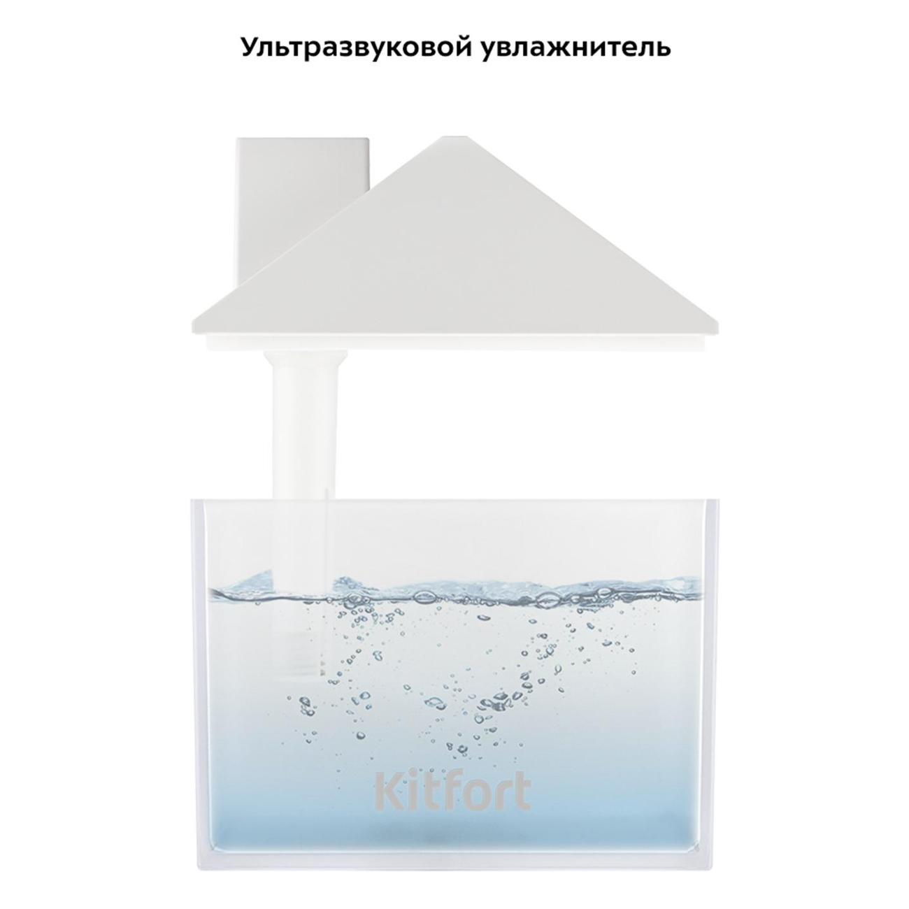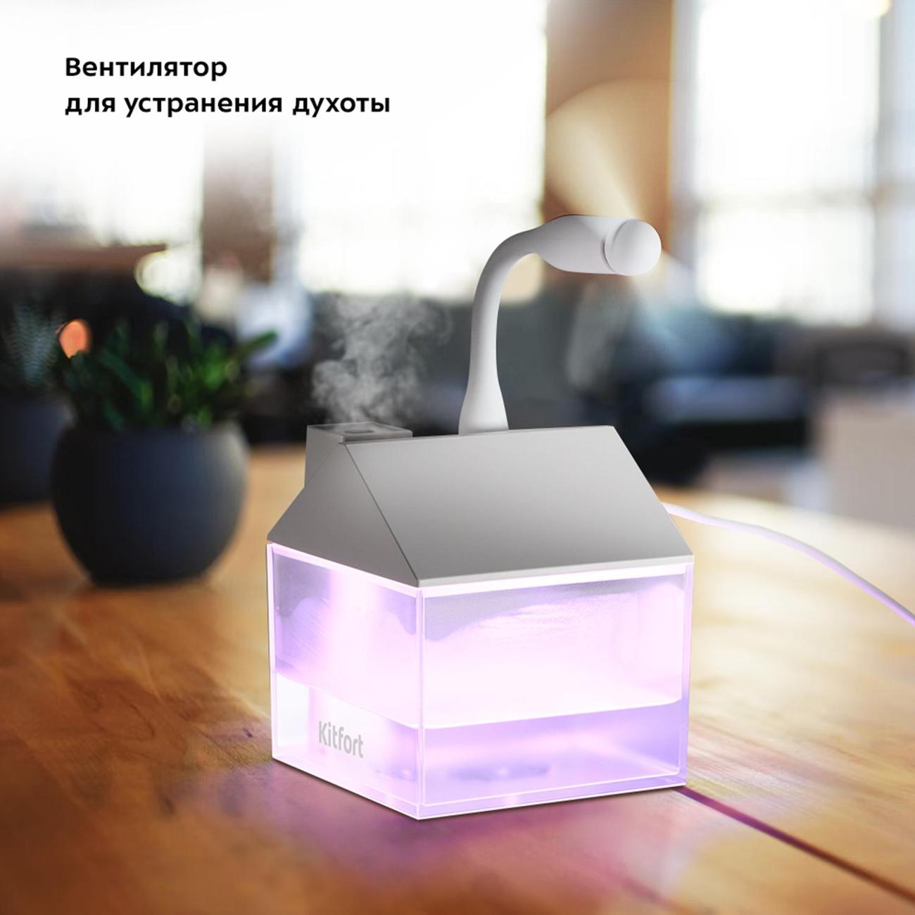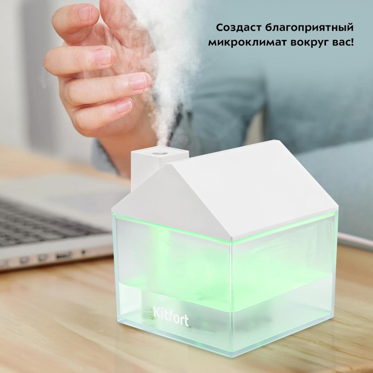 Воздухоувлажнитель Kitfort КТ-2861 — портативный ультразвуковой прибор с простым кнопочным управлением. Оригинальная модель выполнена в форме домика и понравится и взрослым, и детям. Установка — настольная. Объем резервуара для воды равен 0,25 л. В комплектацию входят лампа и вентилятор, которые подключаются через USB-порт в верхней части. Устройство светится разными цветами, что позволяет использовать его как ночную лампу. Максимальная мощность увлажнения воздуха составляет 35 мл/ч.