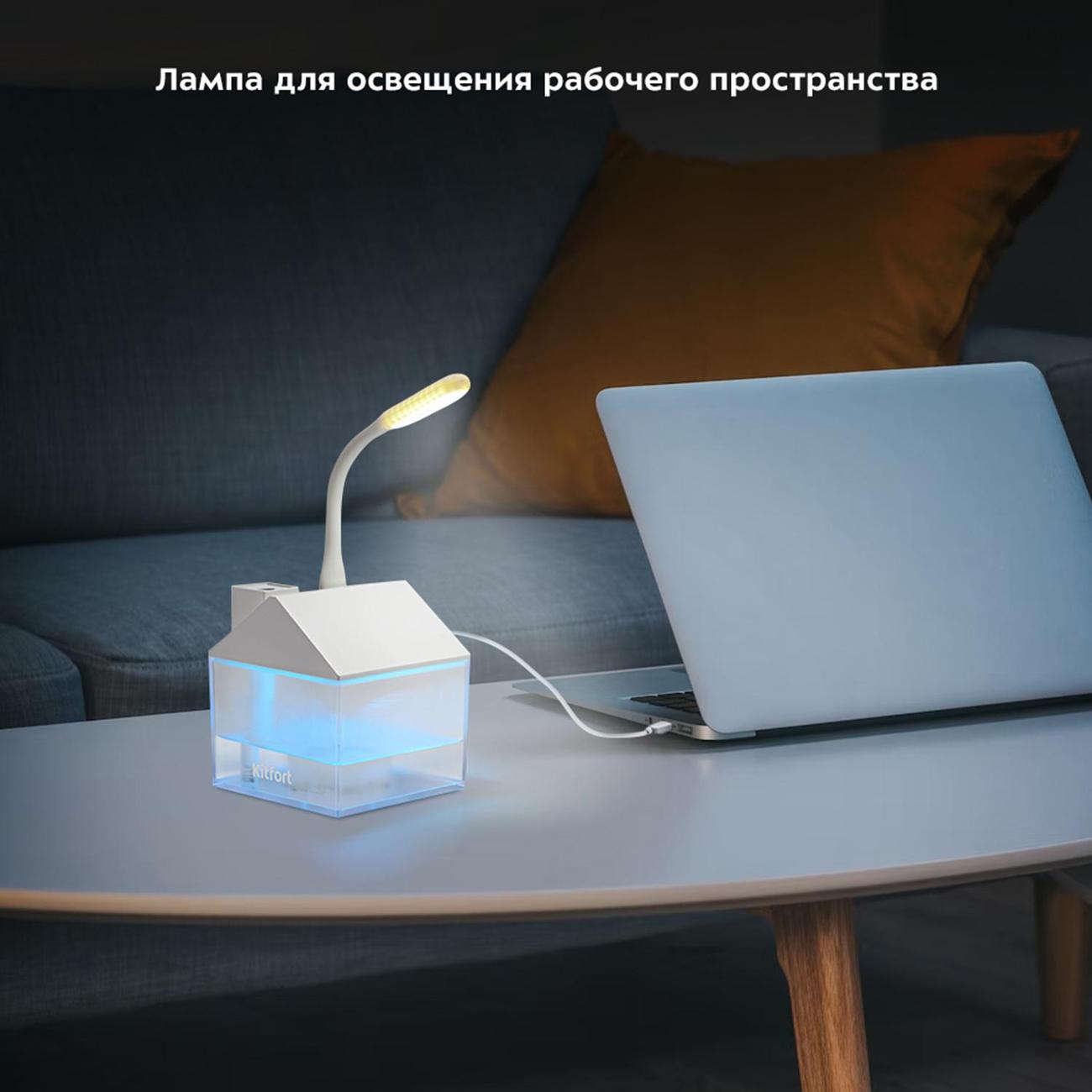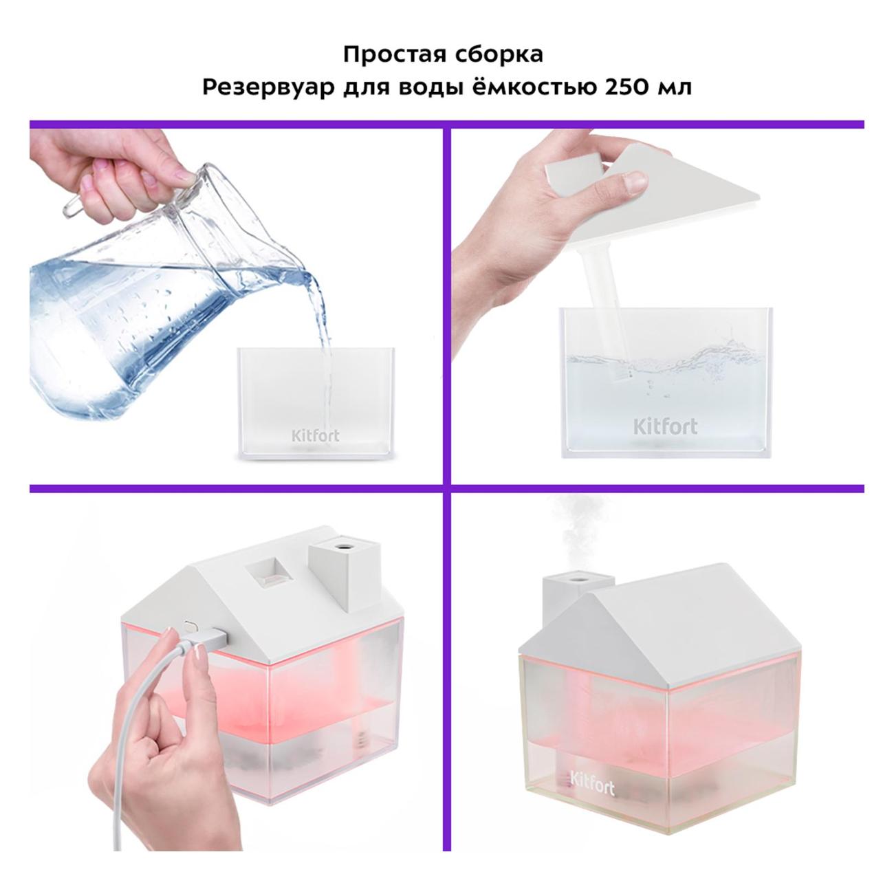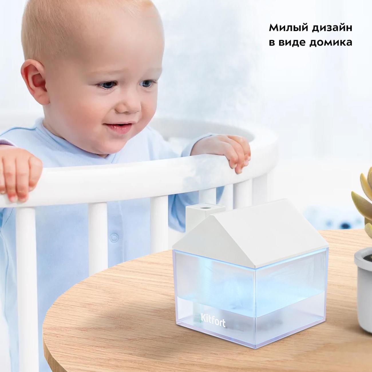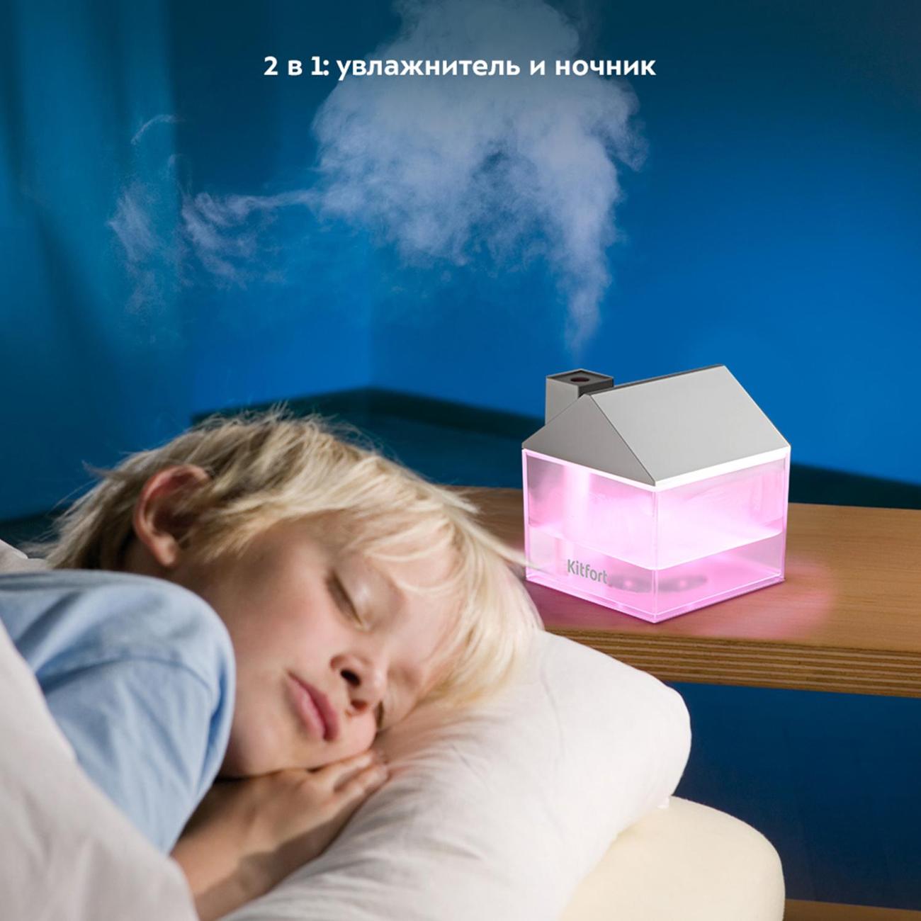 Воздухоувлажнитель Kitfort КТ-2861 — портативный ультразвуковой прибор с простым кнопочным управлением. Оригинальная модель выполнена в форме домика и понравится и взрослым, и детям. Установка — настольная. Объем резервуара для воды равен 0,25 л. В комплектацию входят лампа и вентилятор, которые подключаются через USB-порт в верхней части. Устройство светится разными цветами, что позволяет использовать его как ночную лампу. Максимальная мощность увлажнения воздуха составляет 35 мл/ч.