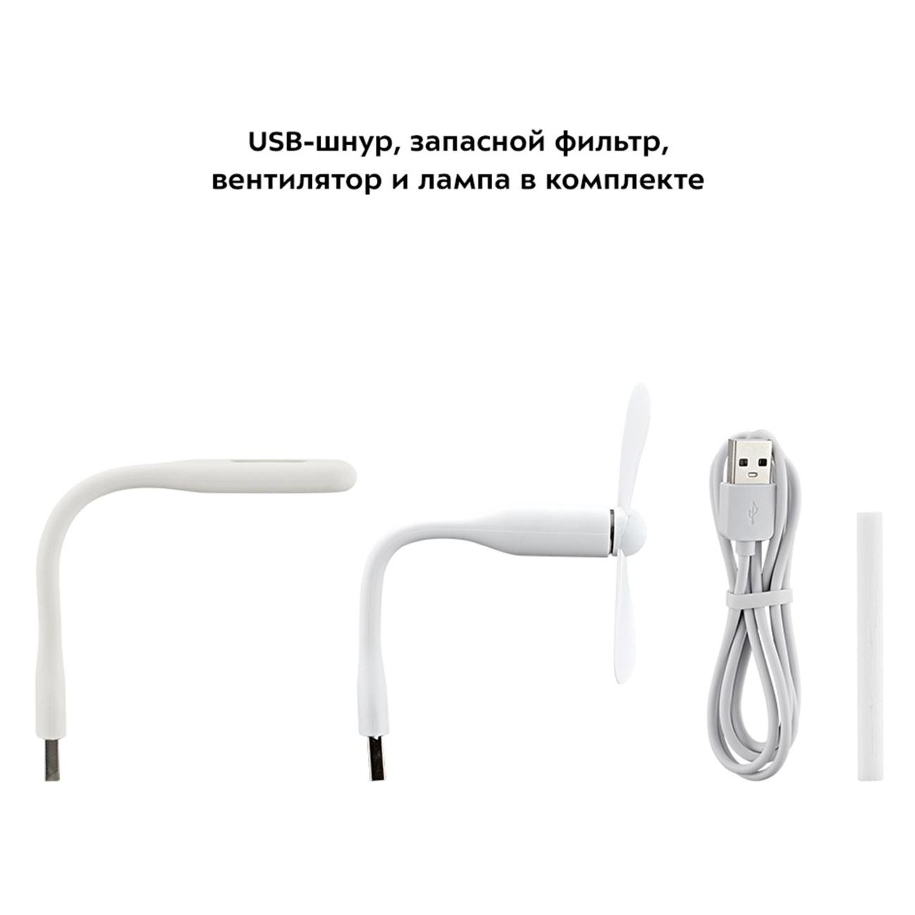 Прибор дополнительно оснащен функцией автоматического отключения. Питание осуществляется посредством USB-порта, потребляемая мощность — 2 Вт. Длина сетевого шнура равна 1 м. Корпус и бак устройства изготовлены из пластика. Цвет — белый. Размеры — 9,3х8,5х8,5. Вес — 0,11 кг.