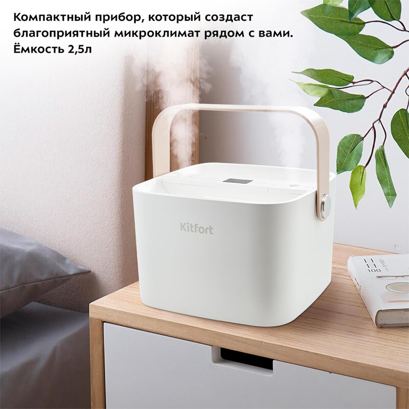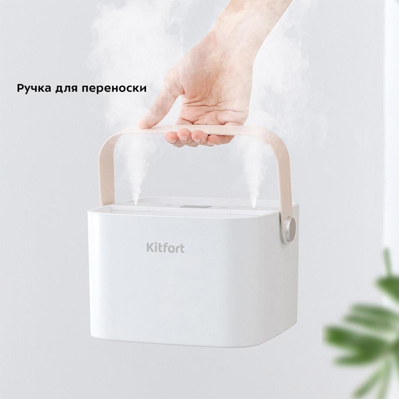 Воздухоувлажнитель Kitfort КТ-2869 выполнен в стильном дизайне, оборудован удобной складной ручкой для переноски. Одна из особенностей модели — встроенный аккумулятор, что позволяет обходиться без источника питания. Для более длительной работы прибор подключается к сети при помощи шнура USB из комплекта. Потребляемая мощность составляет 4,2 Вт.