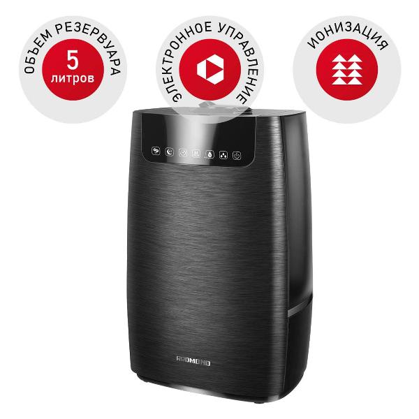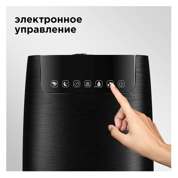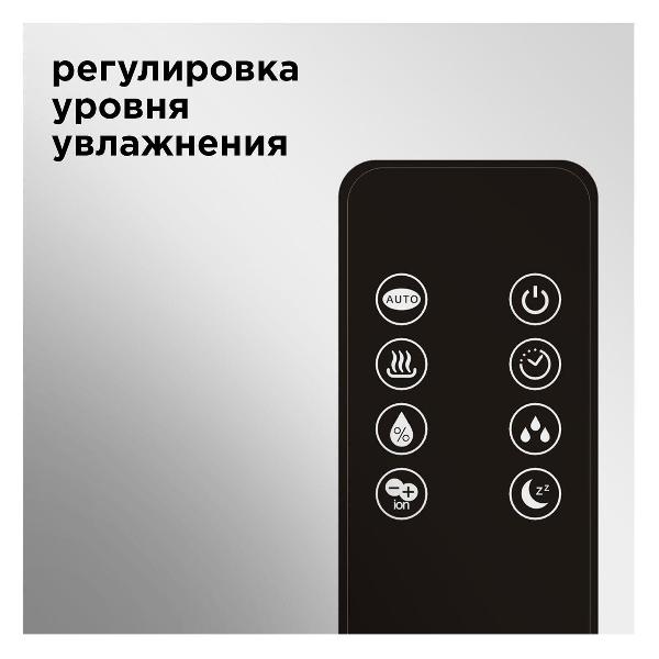 Световые индикации показывают рабочее состояние: включение, уровень воды, влажности. В модели предусмотрены режимы: «Теплый пар», «Ночной», «Автоматический». Управление производится с помощью сенсорной панели, пульта ДУ. На дисплее отображается вся основная информация. Интенсивность испарения можно настраивать. За безопасность эксплуатации отвечает система автоотключения, которая активируется при отсутствии воды в резервуаре. Пиковая мощность составляет 105 Вт.