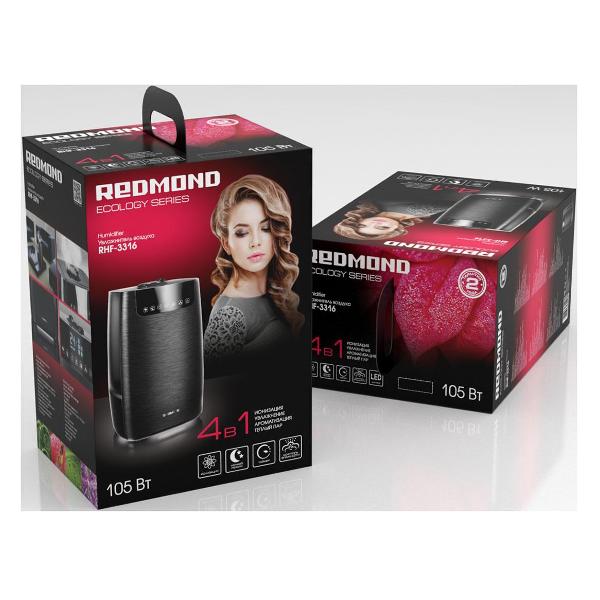 Воздухоувлажнитель Redmond RHF-3316 — устройство ультразвукового типа в прочном, надежном пластиковом корпусе, оснащенном резервуаром объемом 5 л. Подсветка дарит внешнему виду особую изюминку. Расход воды составляет 300 г/ч, что достаточно для эксплуатации в помещении площадью до 35 м². Возможен верхний долив воды. Уровень шума во время работы не превышает 35 дБ. Время непрерывной работы достигает 10 часов. Установка осуществляется на стол или на пол.