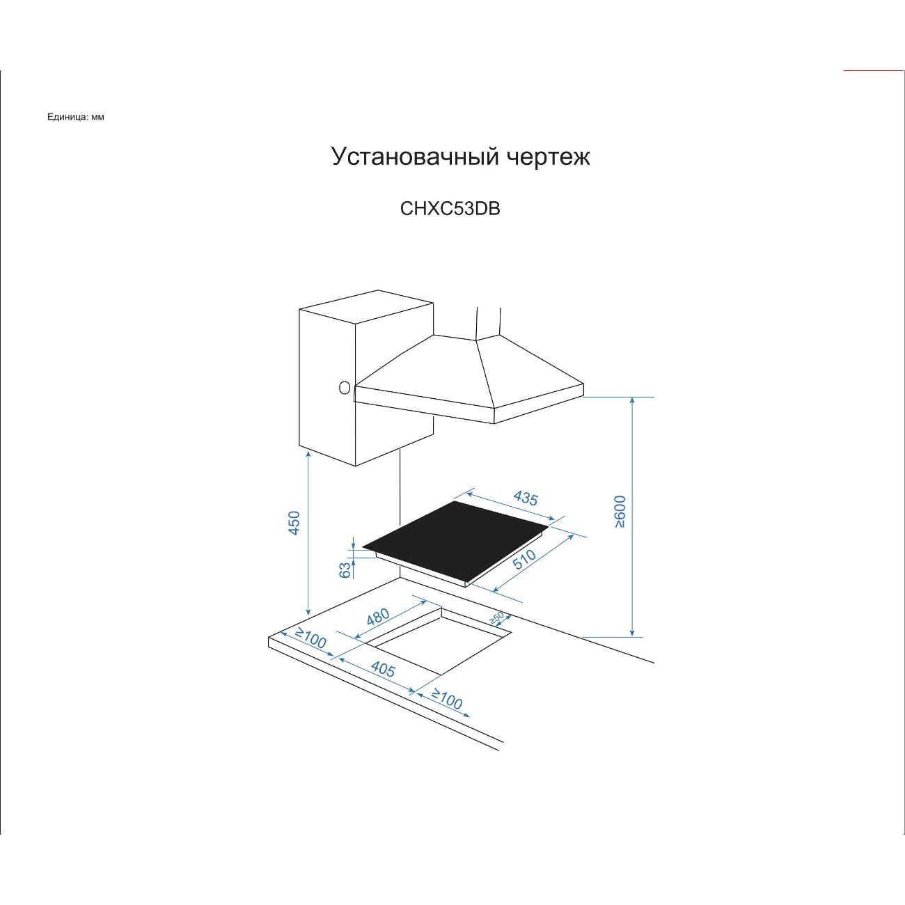 Candy CHXC53DB монтируется в нишу размером 48х40 см при толщине столешницы от 4 см. Края панели ровные без рамки. Сенсорная панель размещена спереди. Таймер приготовления программируется сроком до 99 минут.