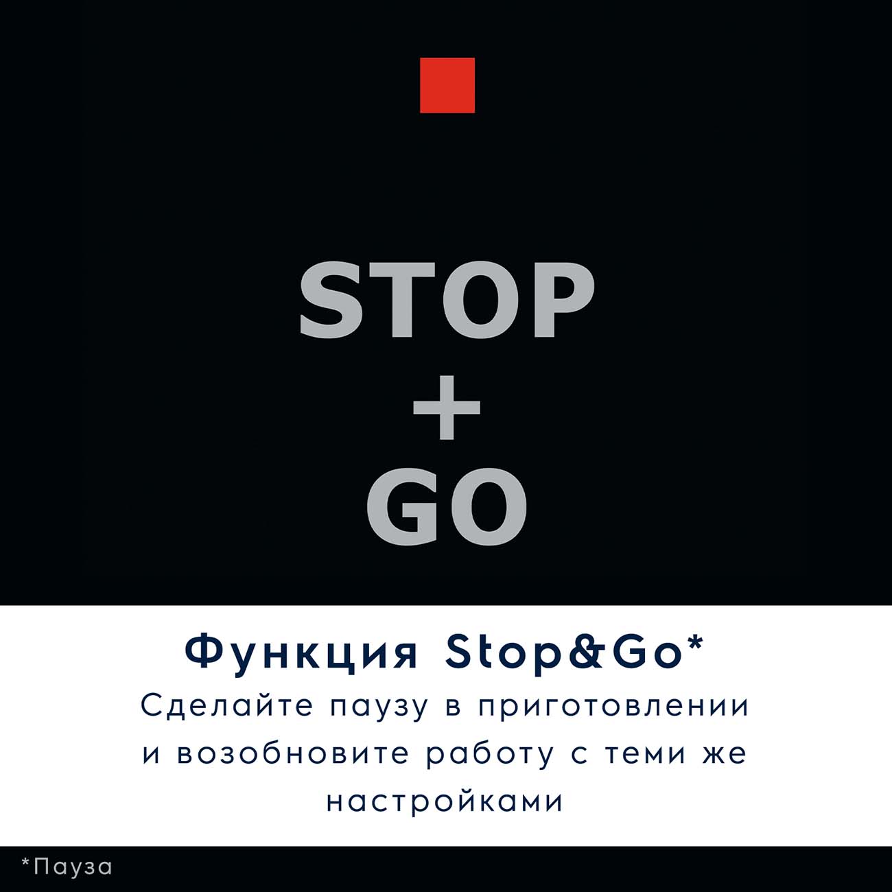 Иногда в работе нужно сделать короткий перерыв. Для этого предусмотрена функция Stop and Go: одно нажатие, и вы сможете отвлечься на другие дела. Когда вы вернётесь к приготовлению, вводить все параметры заново не понадобится.