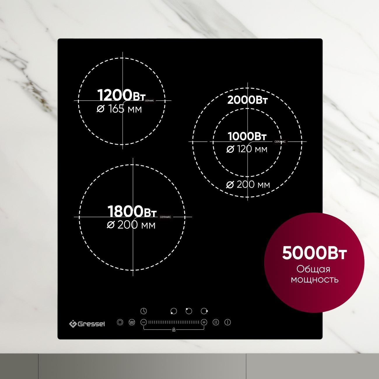 Конфорки диаметром 16,5 и 20 см подходят для различной посуды. Мощность 1,2, 1,8 и 2 кВт гарантирует равномерное распределение тепла и быстрый разогрев без потерь энергии.
