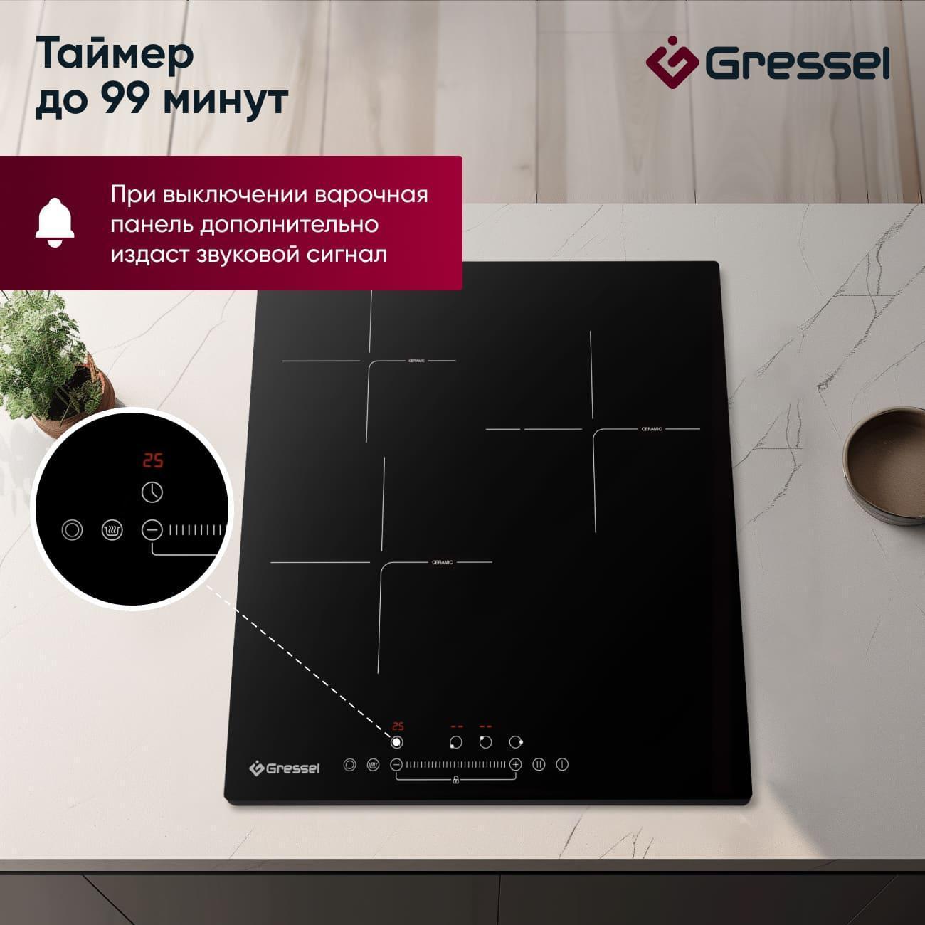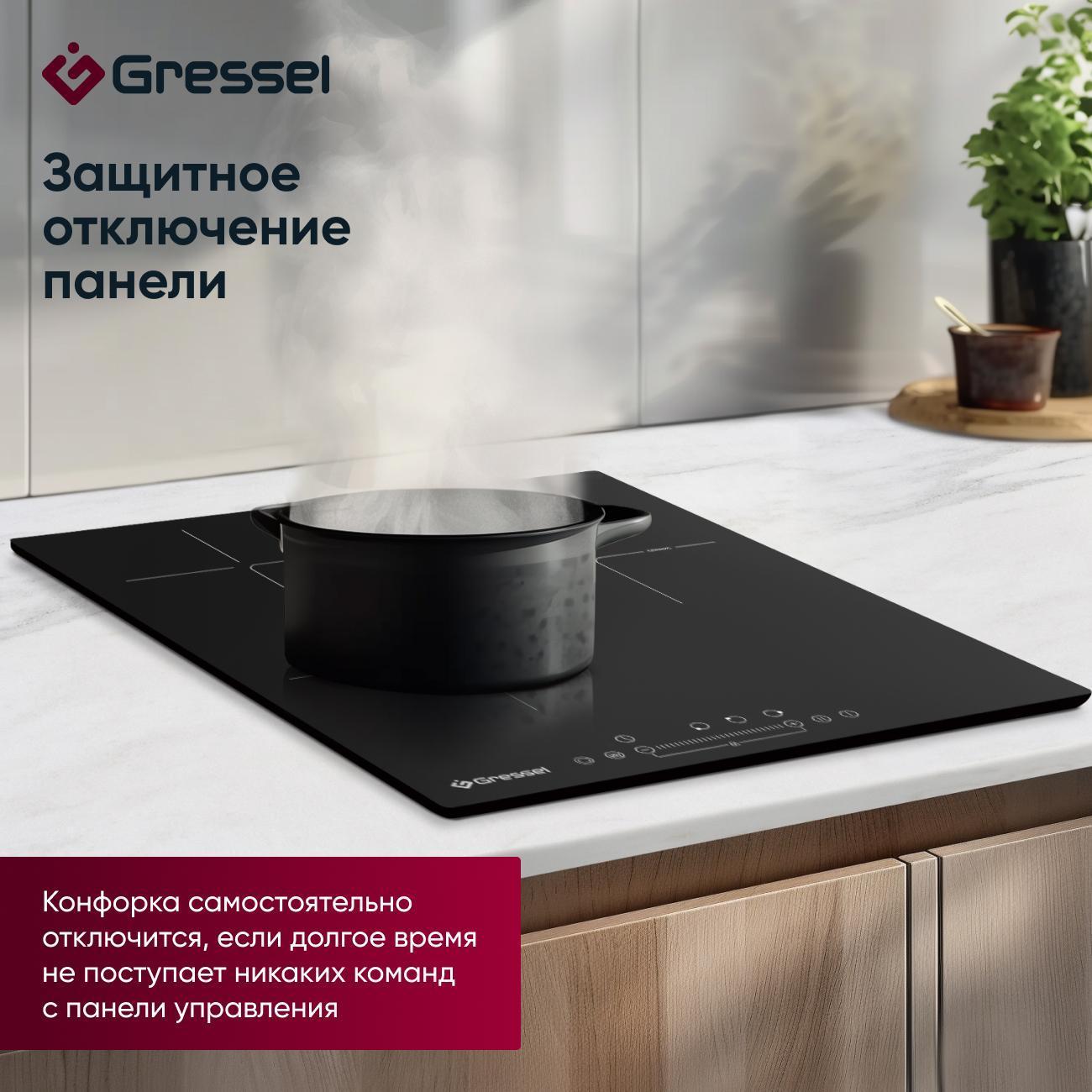 Встраиваемая электрическая панель Gressel U45D29S100 выполнена из закаленного стекла без рамки. Компактные размеры 450х510 мм подходят для ниш шириной 425 мм, обеспечивая аккуратную установку и надежное крепление в столешнице толщиной от 30 мм.