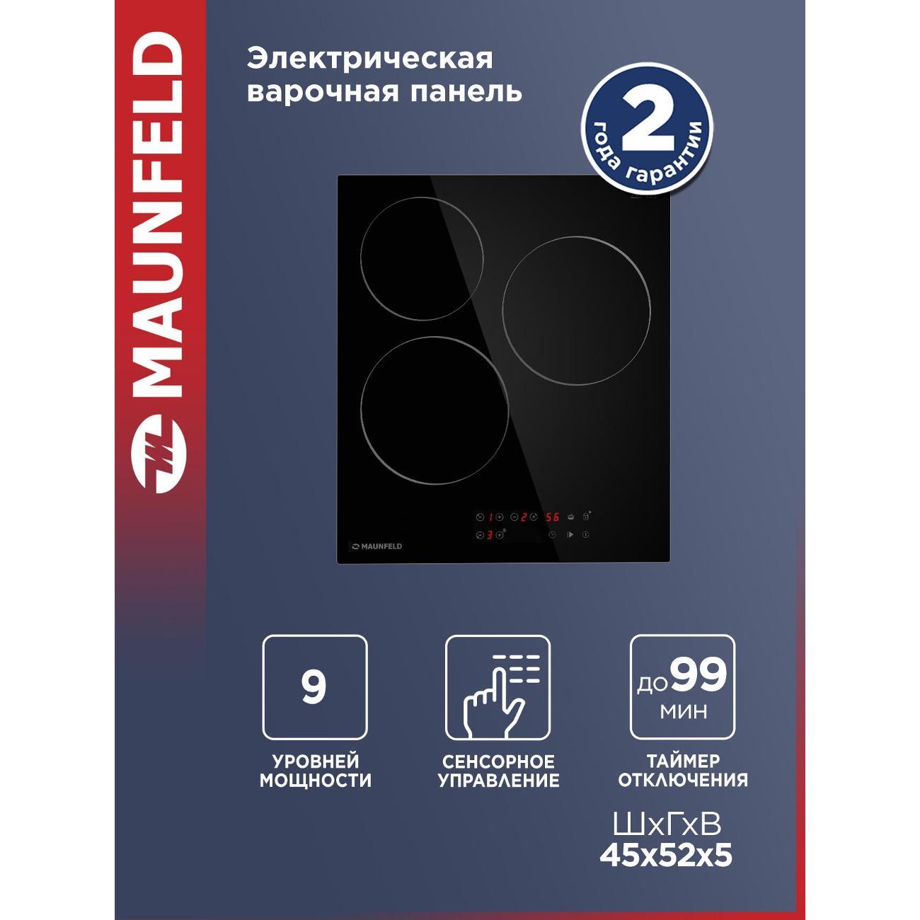 Встраиваемая независимая электрическая панель Maunfeld CVCE453BK, черная оснащена тремя конфорками общей мощностью 4800 Вт.