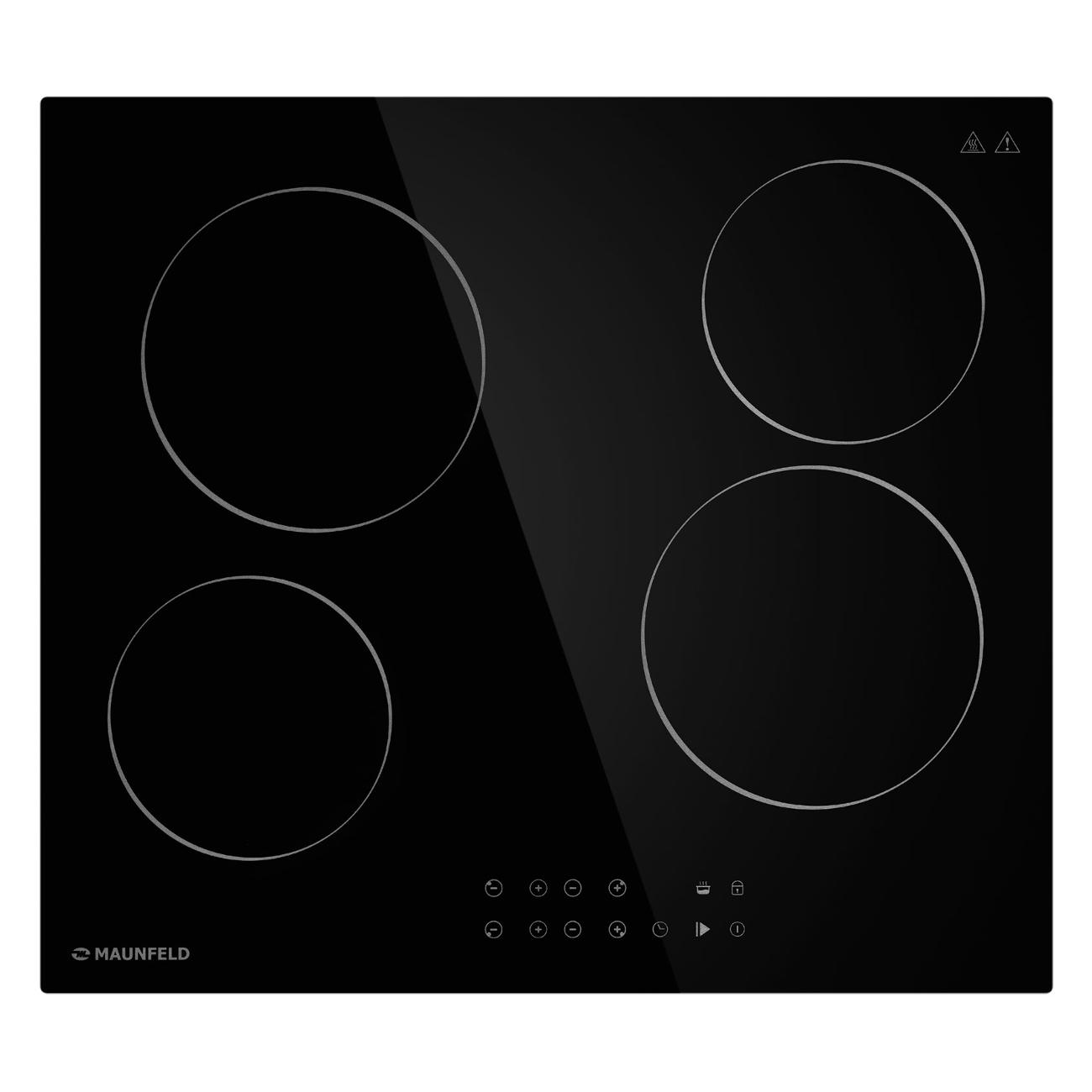 Встраиваемая независимая электрическая панель Maunfeld CVCE594BK, черная оснащена четырьмя конфорками общей мощностью 6000 Вт.