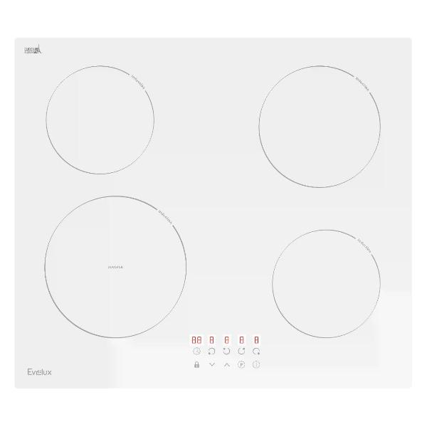 Встраиваемая электрическая плита Evelux HEI 641 W с индукционными конфорками монтируется независимо от расположения духового шкафа. Белая безрамочная поверхность с обработанными краями выполнена из ударопрочной стеклокерамики, фиксируется в нише размером 560x490 мм при толщине столешницы от 30 мм.