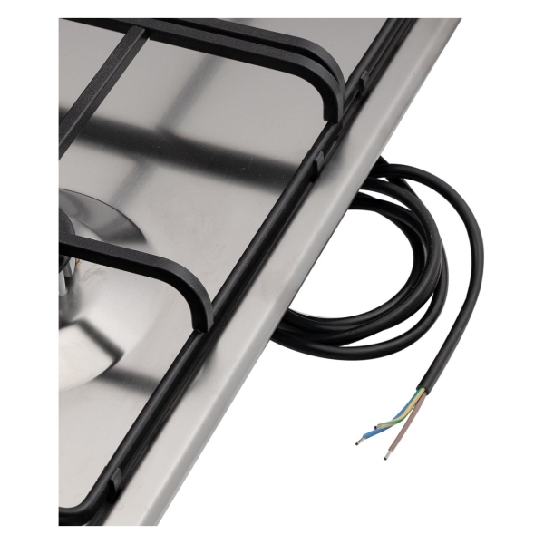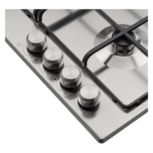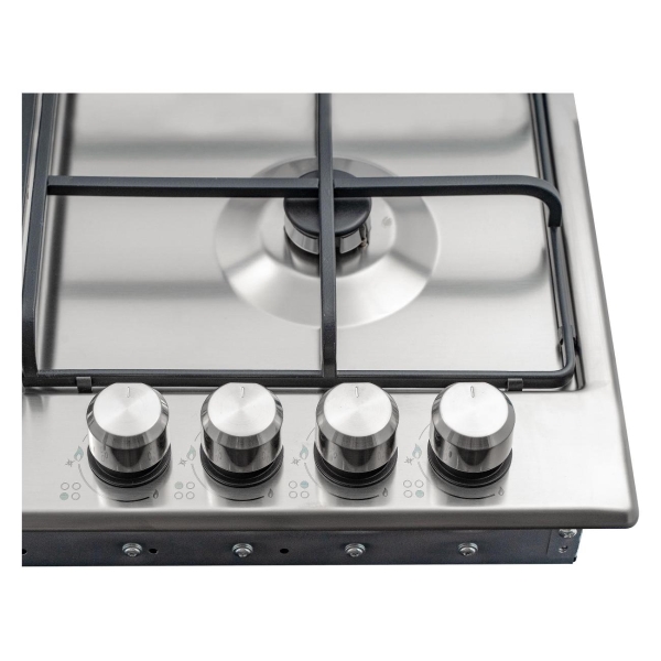 Одна WOK и три стандартные конфорки оборудованы автоматическим электроподжигом, что делает эксплуатацию удобной. За безопасность отвечает система газ-контроля. Для управления используются поворотные регуляторы с интуитивно понятным обозначением. Переключатели расположены спереди справа. Устройство поставляется с жиклерами для подсоединения баллона.