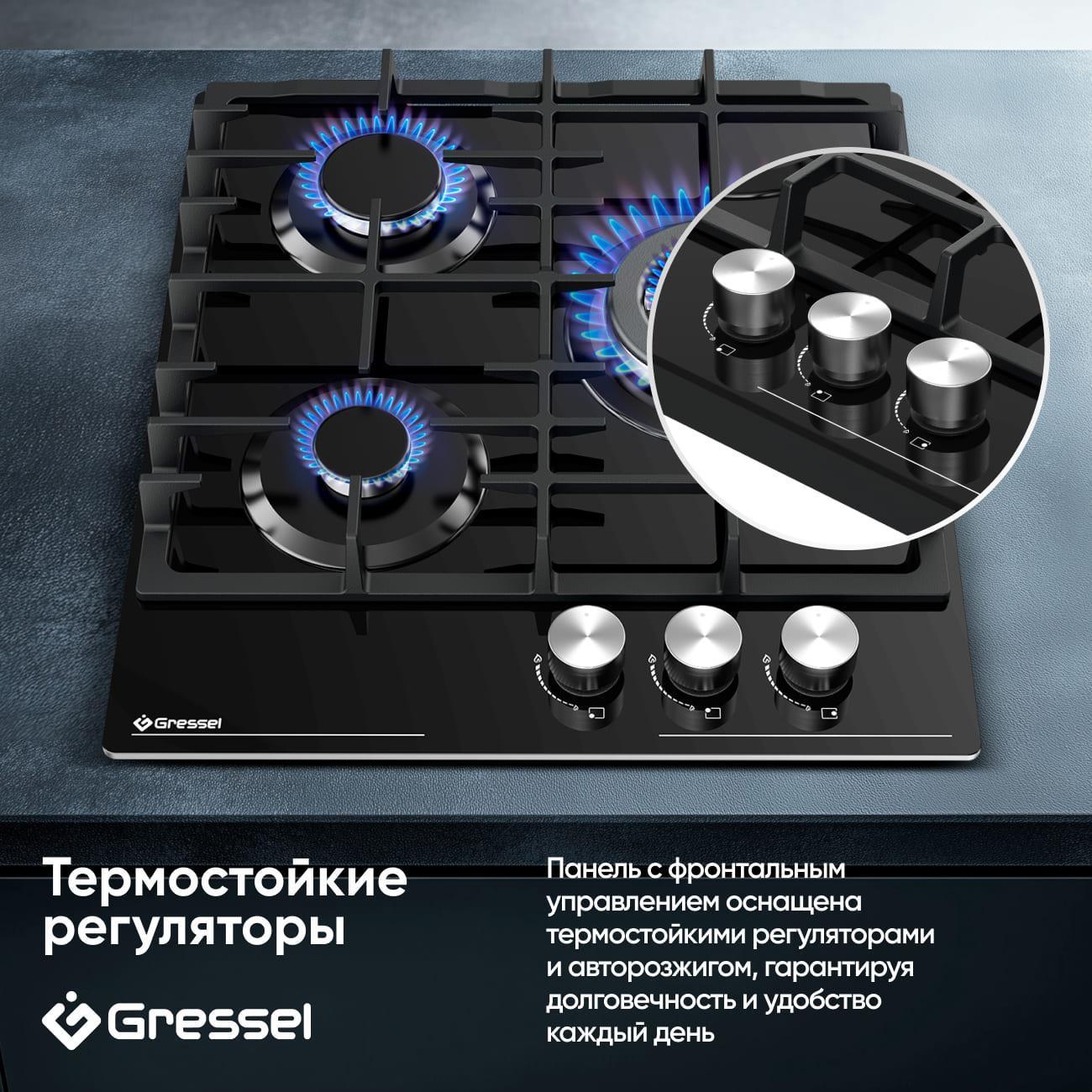 Встраиваемая независимая газовая панель Gressel U45H35S001 устанавливается в нишу размером 410х465 мм, толщина столешницы — 40 мм.