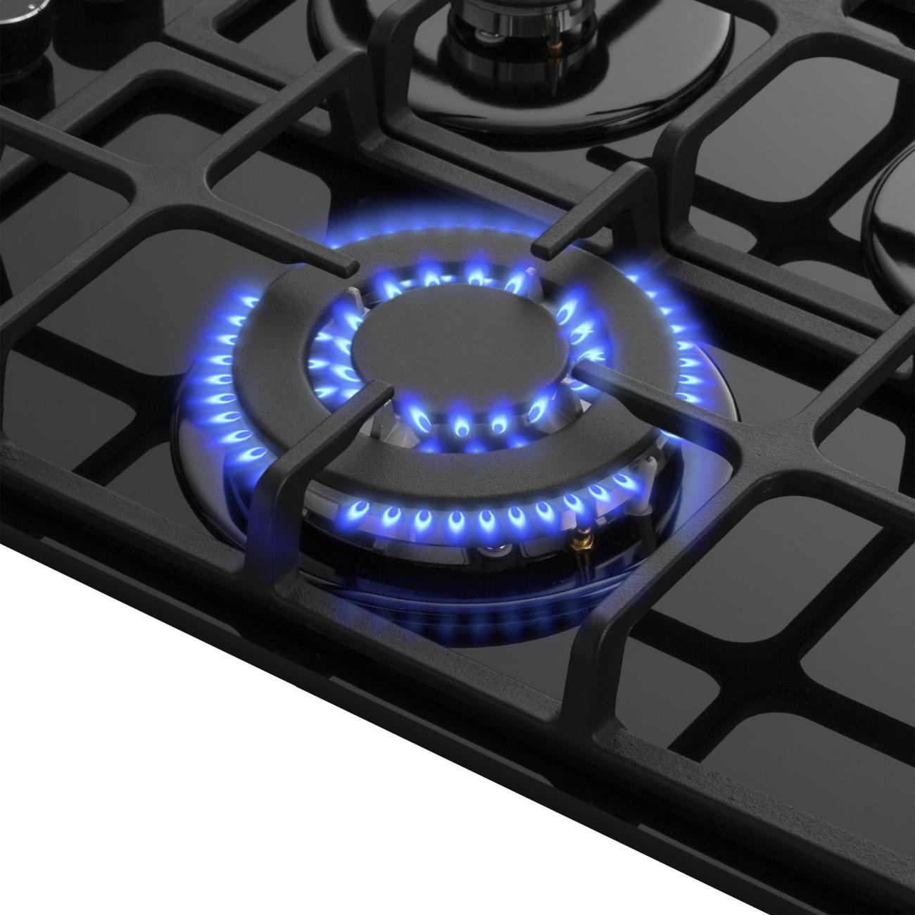 Панель оснащена четырьмя конфорками. Стандартных конфорок три, мощностью 3 кВт, 1,75 кВт и 1,7 кВт. Также предусмотрена конфорка WOK мощностью 3,8 кВт. Управление панелью осуществляется с помощью поворотных переключателей. Встроенный электроподжиг позволяет зажигать конфорки автоматически. Газ-контроль обеспечивает безопасность использования панели. Комплектация включает жиклеры для работы от газового баллона. Для встраивания газовой панели требуется столешница толщиной не менее 90 мм.