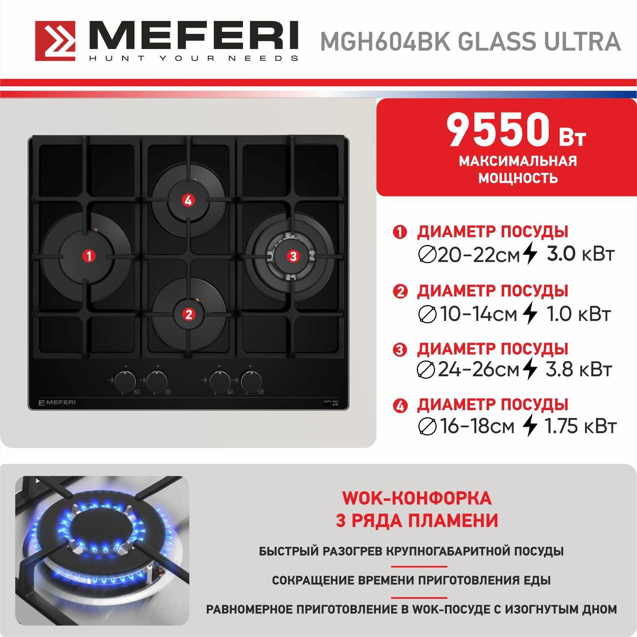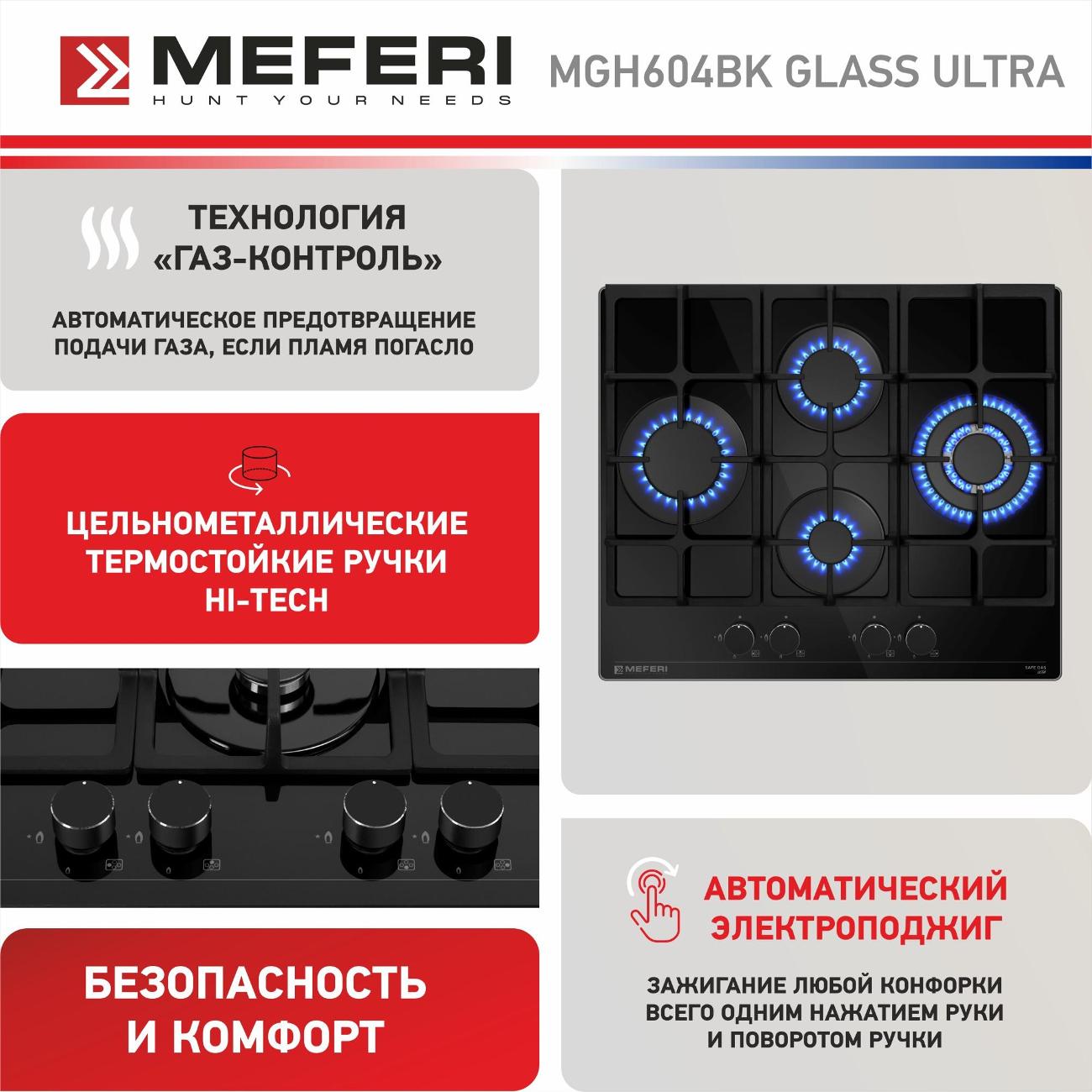 Встраиваемая независимая газовая панель MEFERI MGH604BK Glass Ultra в черном корпусе — современное и функциональное решение для кухни. Возможность работы от газового баллона позволяет использовать панель даже в тех случаях, когда нет доступа к газопроводу.