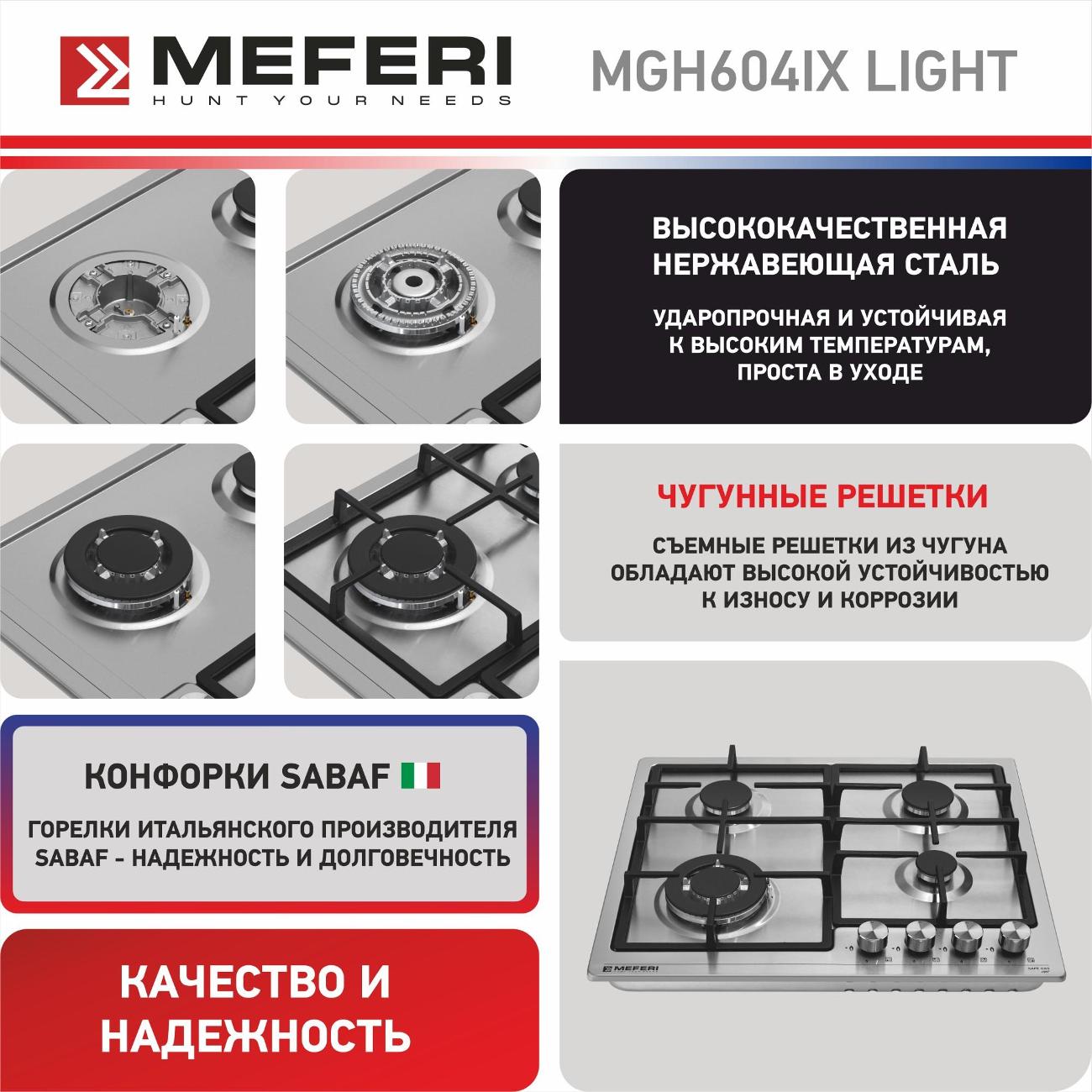 Встраиваемая независимая газовая панель Meferi MGH604IX Light в серебристом корпусе — современное и функциональное решение для кухни. Возможность работы от газового баллона позволяет использовать панель даже в тех случаях, когда нет доступа к газопроводу.