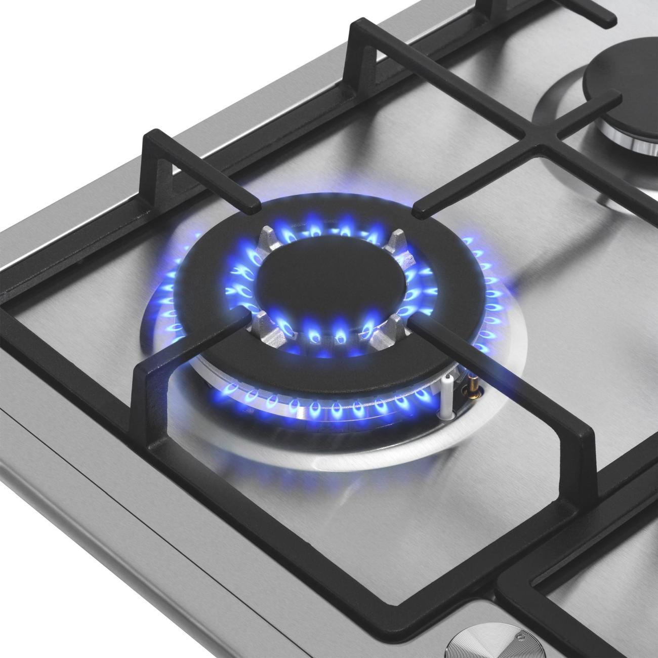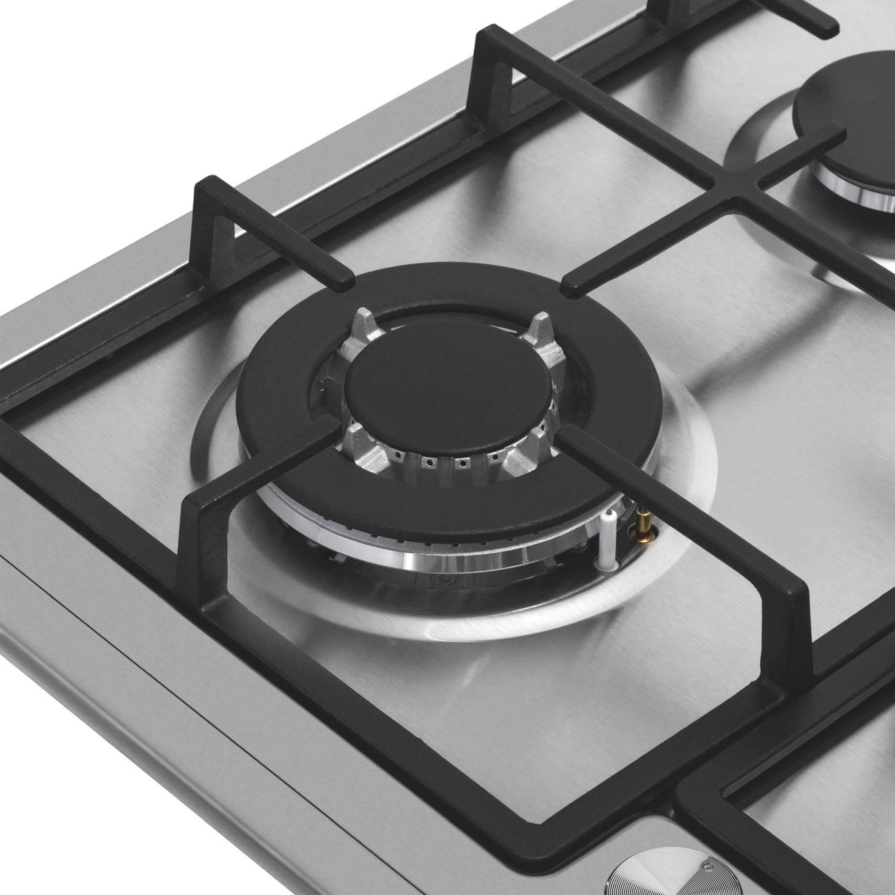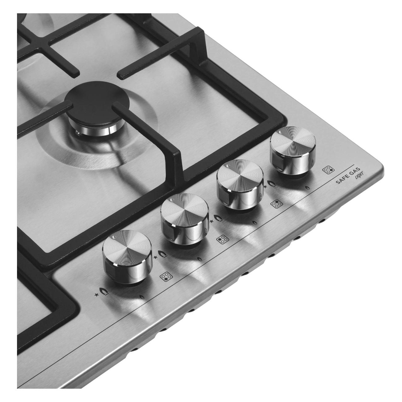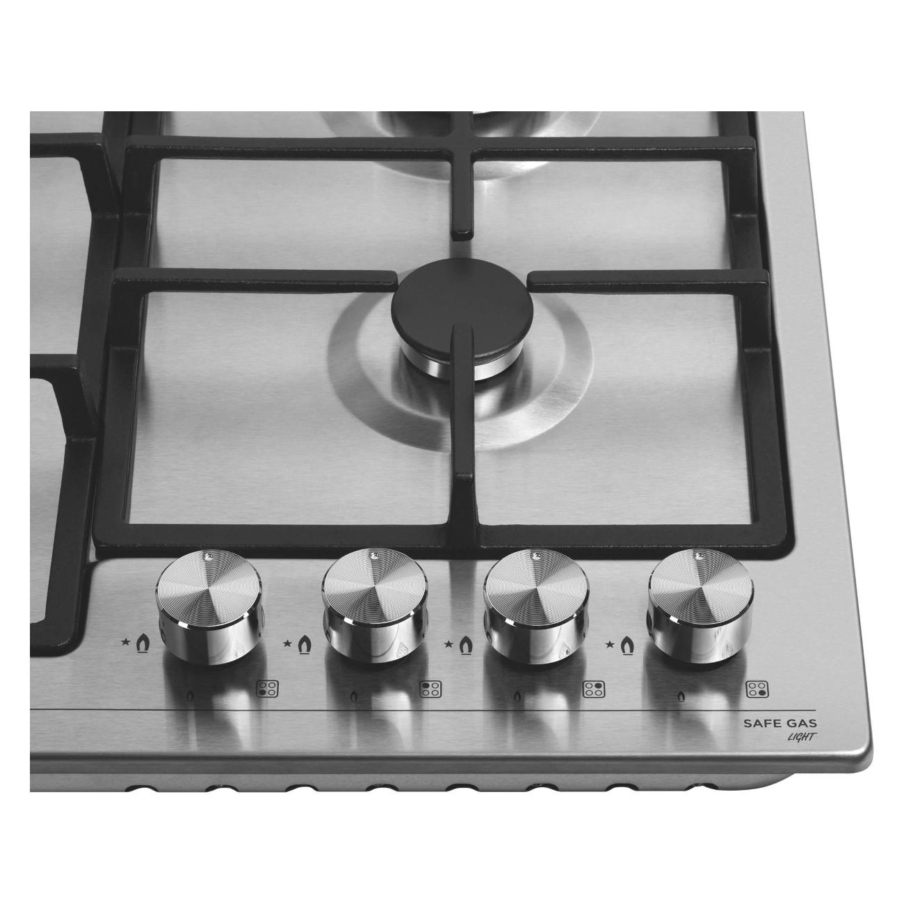 Панель оснащена четырьмя конфорками. Стандартных конфорок три, мощностью 3 кВт, 1,75 кВт и 1,7 кВт. Также предусмотрена конфорка WOK мощностью 3,8 кВт. Управление панелью осуществляется с помощью поворотных переключателей. Встроенный электроподжиг позволяет зажигать конфорки автоматически. Газ-контроль обеспечивает безопасность использования панели. Комплектация включает жиклеры для работы от газового баллона. Для встраивания газовой панели требуется столешница толщиной не менее 90 мм.