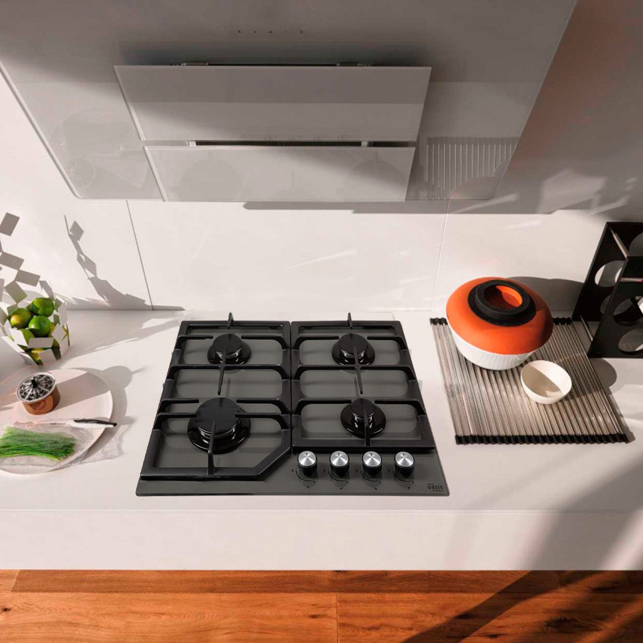 Независимая встраиваемая газовая панель «making Oasis everywhere» P-GG серого цвета оснащена четырьмя конфорками мощностью 1 кВт, 2 кВт, 2 кВт и 2,9 кВт. На корпусе находится панель с механическим управлением — регуляторы оформлены в серебристом цветовом решении. Варочная поверхность изготовлена из закалённого стекла и дополнена решёткой из чугуна.