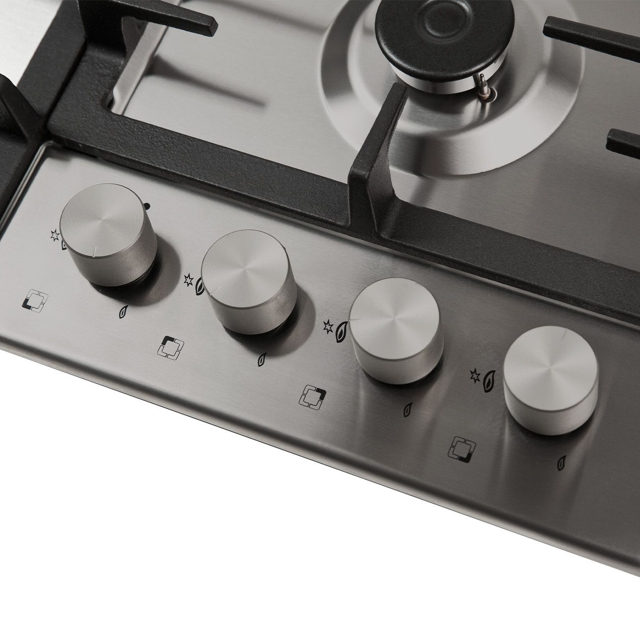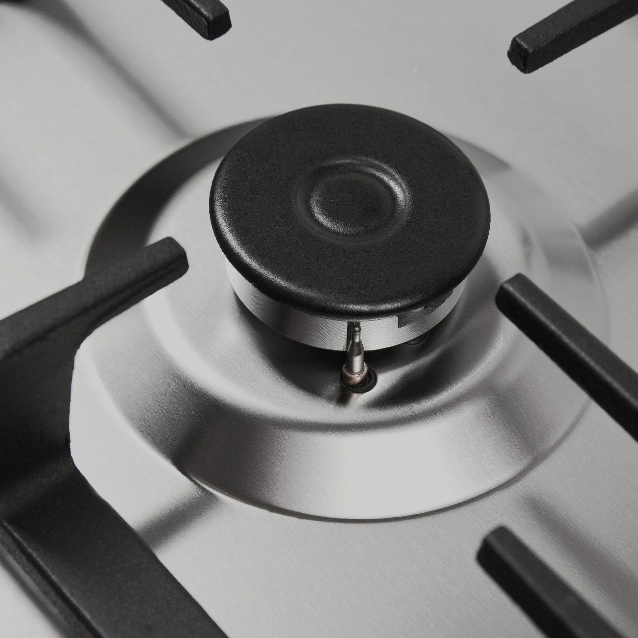 В газовой панели четыре конфорки мощностью от 0,9 кВт до 2,9 кВт. В устройстве предустанавливается система газ-контроля. Аппарат обладает механическим типом управления.
