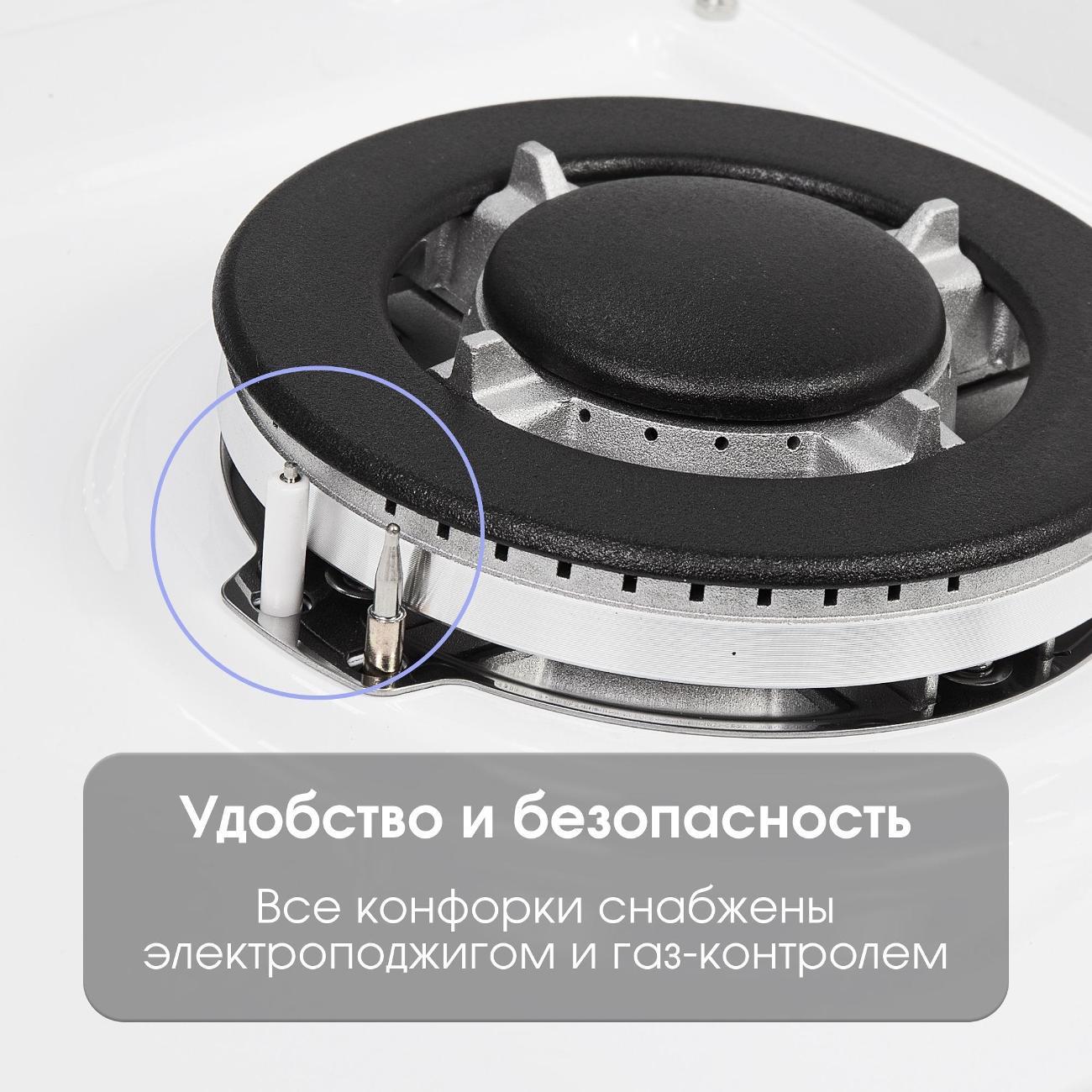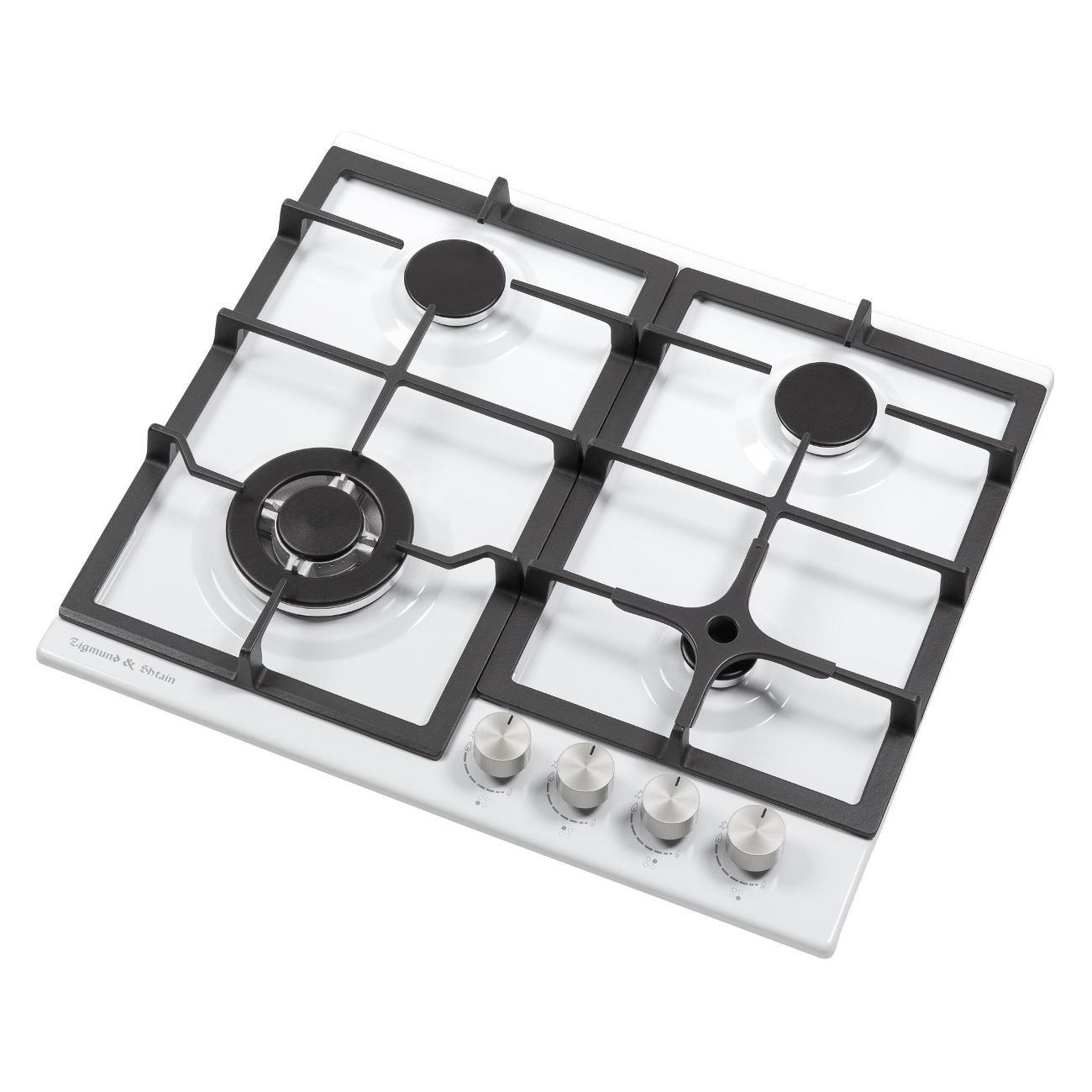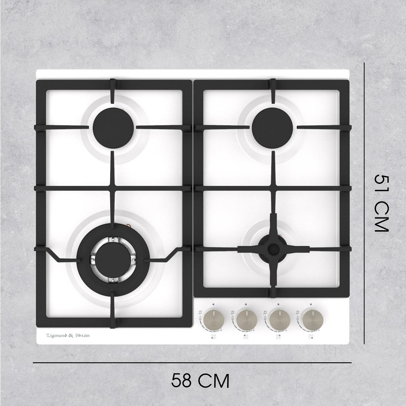 Встраиваемая независимая газовая панель Zigmund & Shtain G 14.6 W белого цвета идет в комплекте с двумя чугунными решетками, подставкой для кофейника, кабелем. Корпус сделан из эмалированной стали толщиной 7 мм. Присутствует функция минимального огня, система газового контроля. Прибор оснащен четырьмя конфорками с автоматическим электроподжигом (три стандартные и одна двухконтурная). Габариты — 58х51 см. Вес изделия — 12 кг. Мощность — от 0,9 до 3,5 кВт. Способ управления — с помощью поворотных ручек на фронтальной части панели.