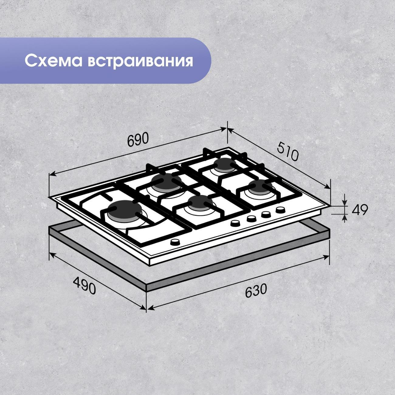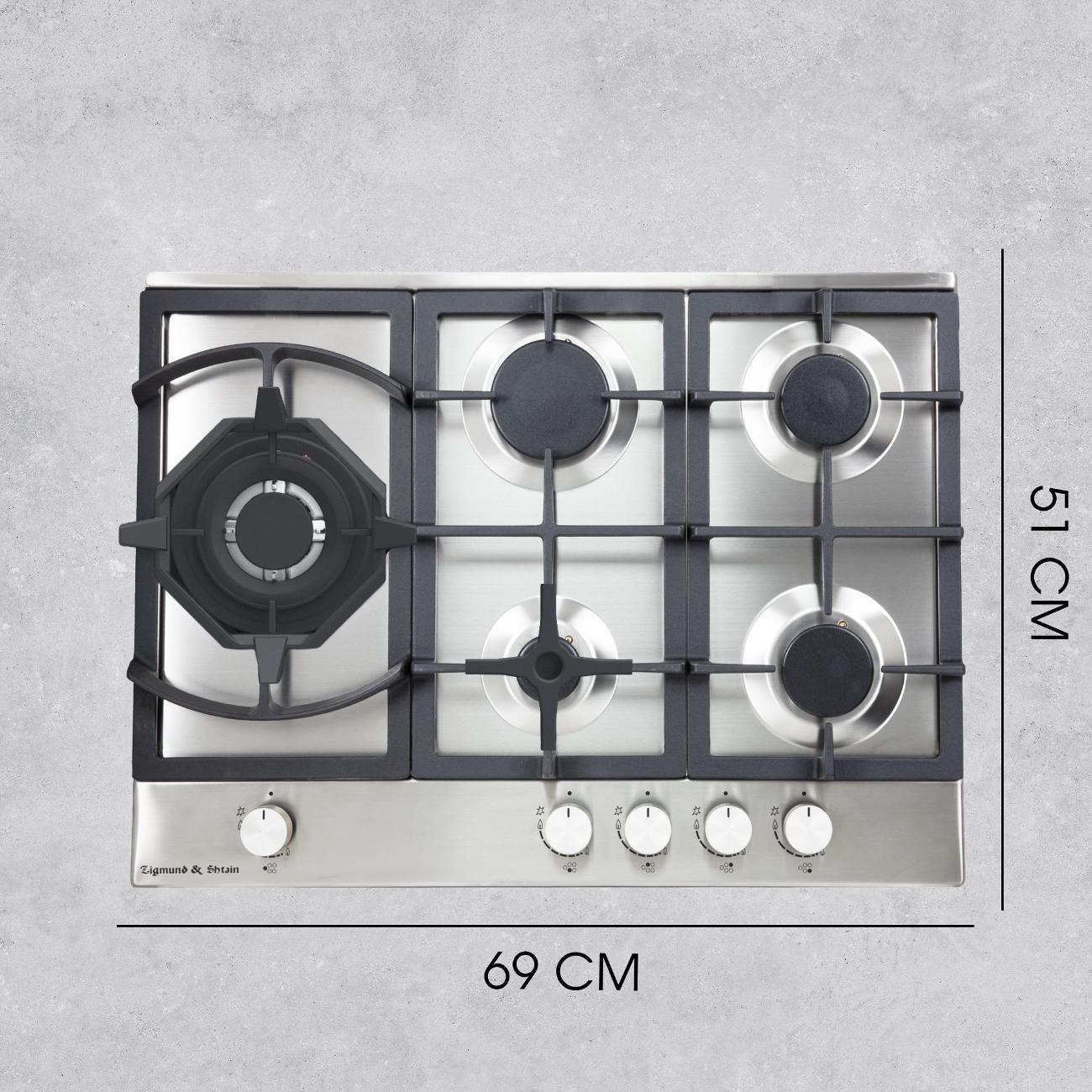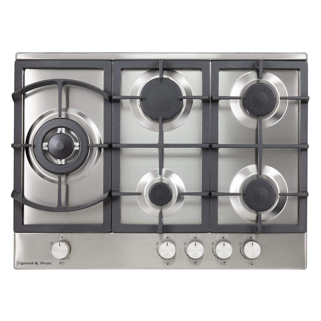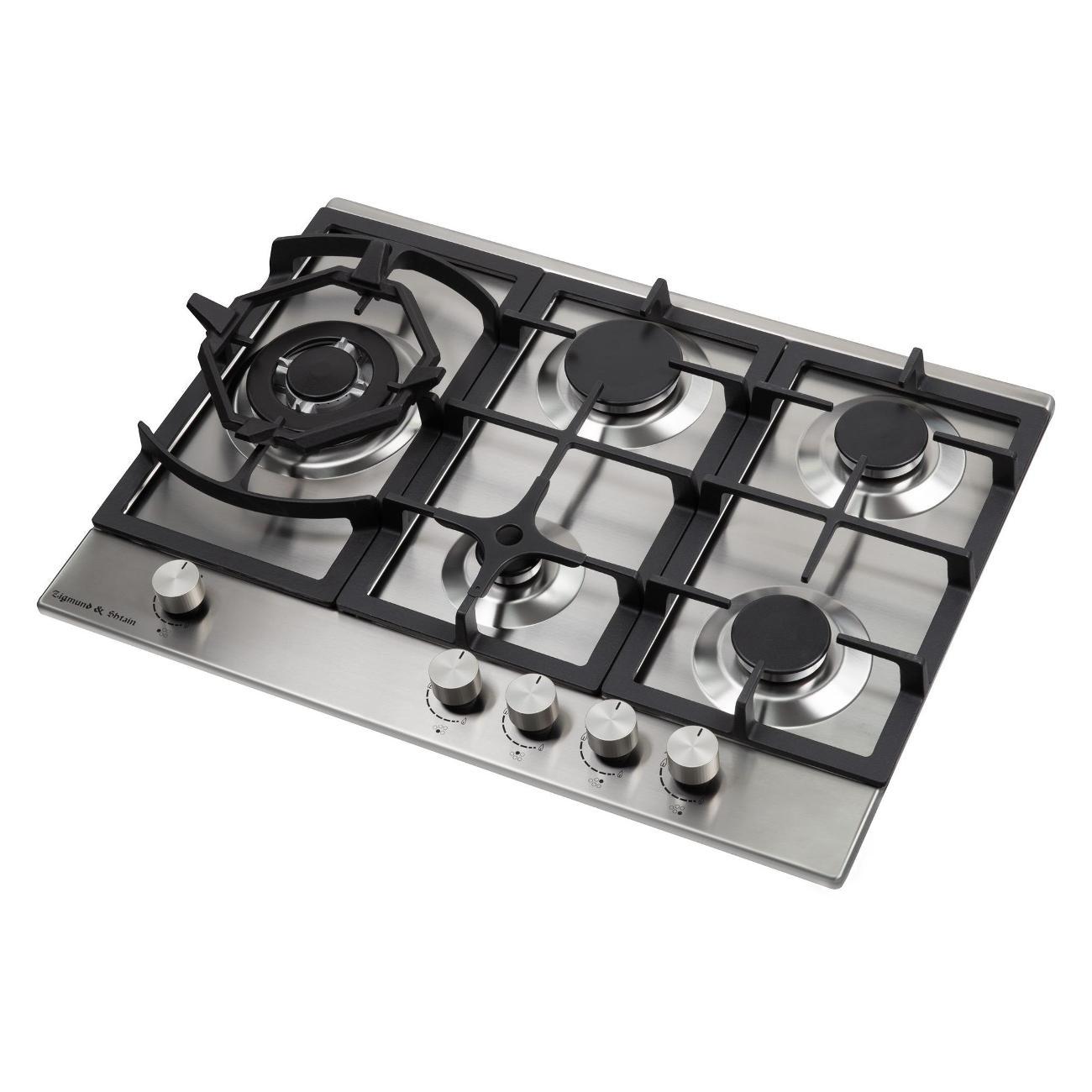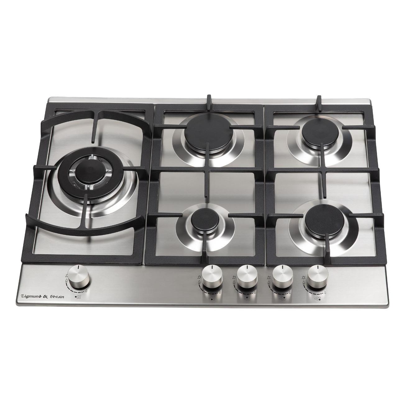 Независимая встраиваемая газовая панель Zigmund & Shtain G 14.7 S стального цвета с пятью конфорками оснащена системой газового контроля и термоизолированными ручками управления. Габариты модели — 69х51,5 см. Вес изделия — 15 кг. Прибор встраивается в столешницу толщиной не менее 4,5 см. Корпус сделан из прочной стали с антикоррозийными свойствами, покрыт гладкой эмалью. Материл легко очищается от загрязнений. Слева расположена увеличенная Wok-горелка с несколькими рядами пламени. Мощность конфорок — от 0,9 до 3,8 кВт. Способ подключения — независимый.