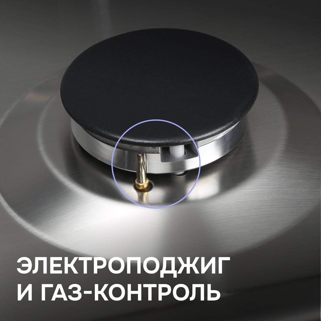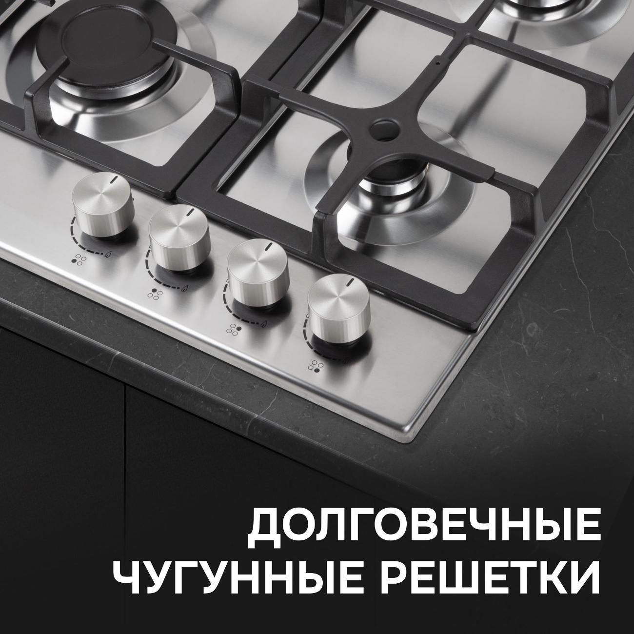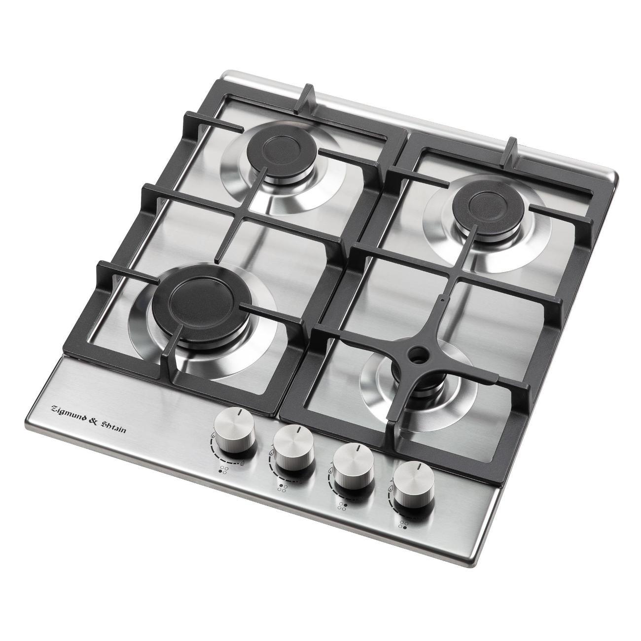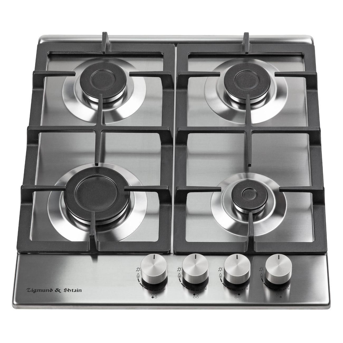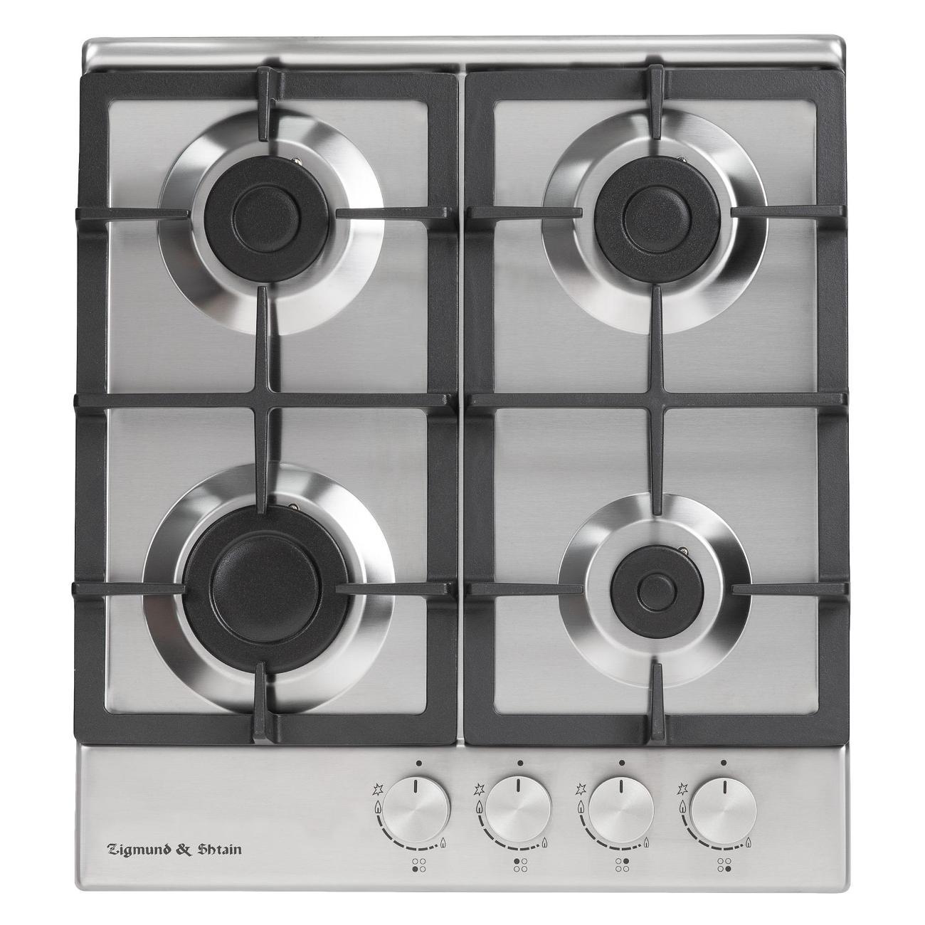 Встраиваемая независимая газовая панель Zigmund & Shtain G 15.4 S стального цвета оснащена функцией минимального огня. Габариты — 46х51 см. Вес изделия — 10 кг. Присутствуют четыре стандартные конфорки. В комплекте идут кабель, две чугунные решетки и подставка под кофейник. Система защиты отключает подачу газа, если пламя погаснет. Корпус сделан из стали, устойчивой к образованию коррозии, покрыт гладкой эмалью. Способ управления — поворотный. Прибор врезается в столешницу толщиной от 5 см. Каждая ручка оснащена электроподжигом. Мощность — от 0,9 до 2,5 кВт.