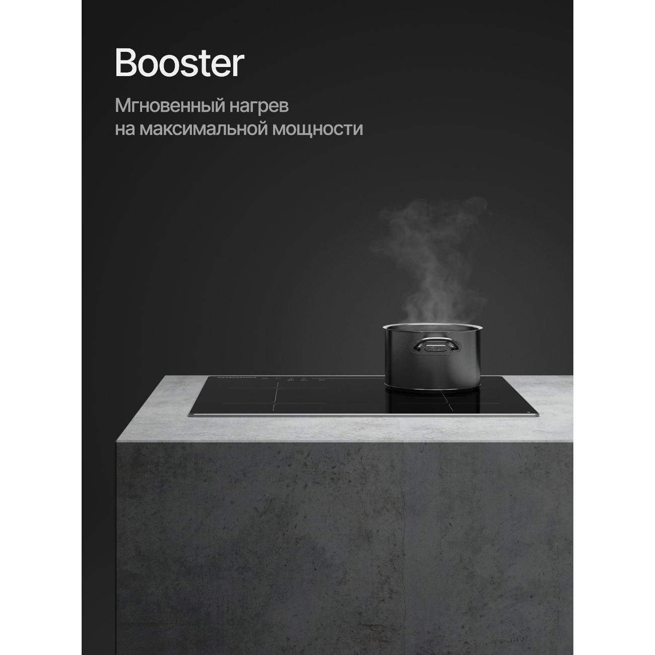 Панель оснащена тремя индукционными конфорками разного диаметра и мощности. Задняя и передняя левые конфорки диаметром 180 мм обладают базовой мощностью 1,8 кВт с возможностью увеличения до 2 кВт в режиме Booster. Средняя конфорка диаметром 210 мм имеет мощность 2,3 кВт с повышением до 2,5 кВт.