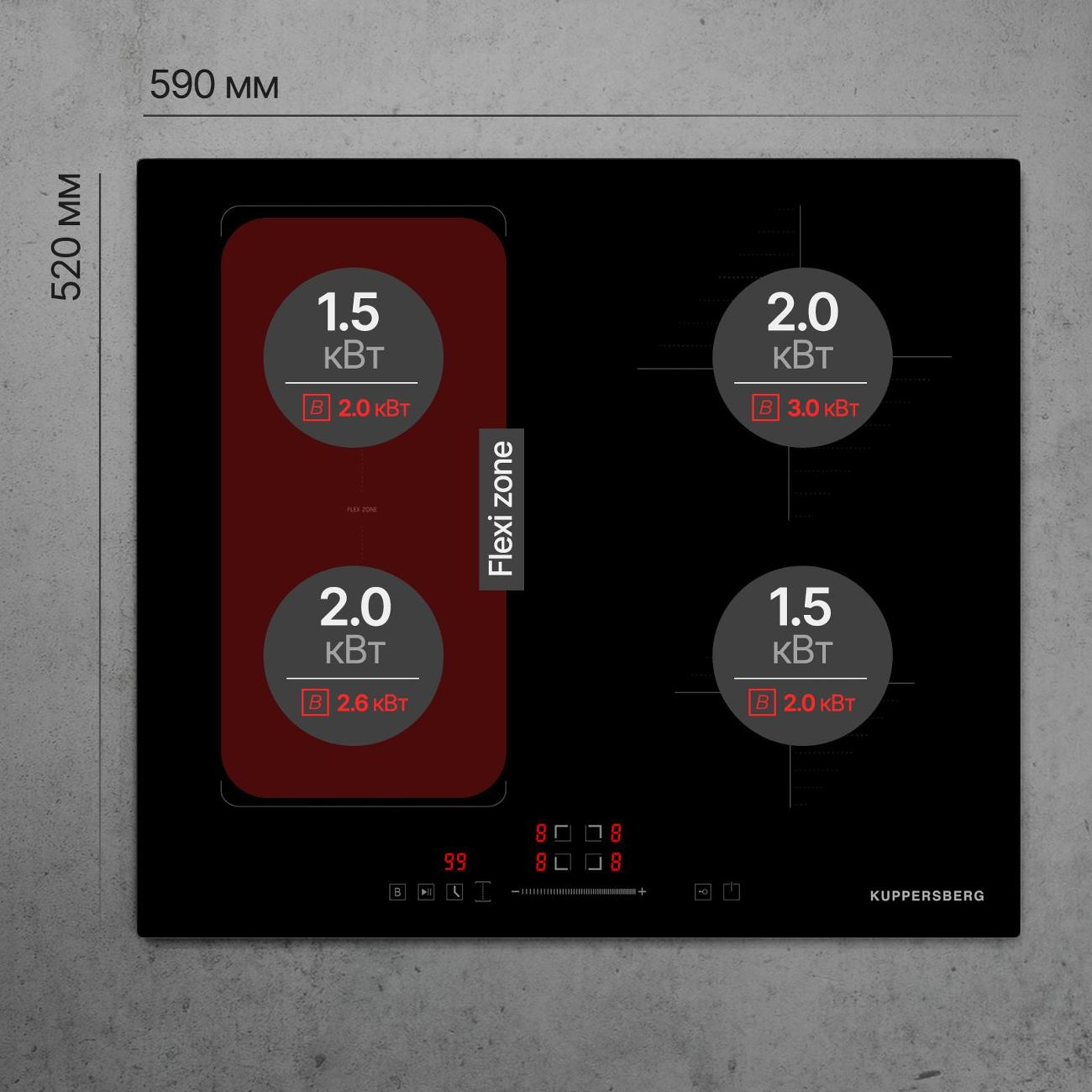 Встраиваемая индукционная панель Kuppersberg ICS 614 работает от электрической сети. Мощность подключения составляет 7 кВт.