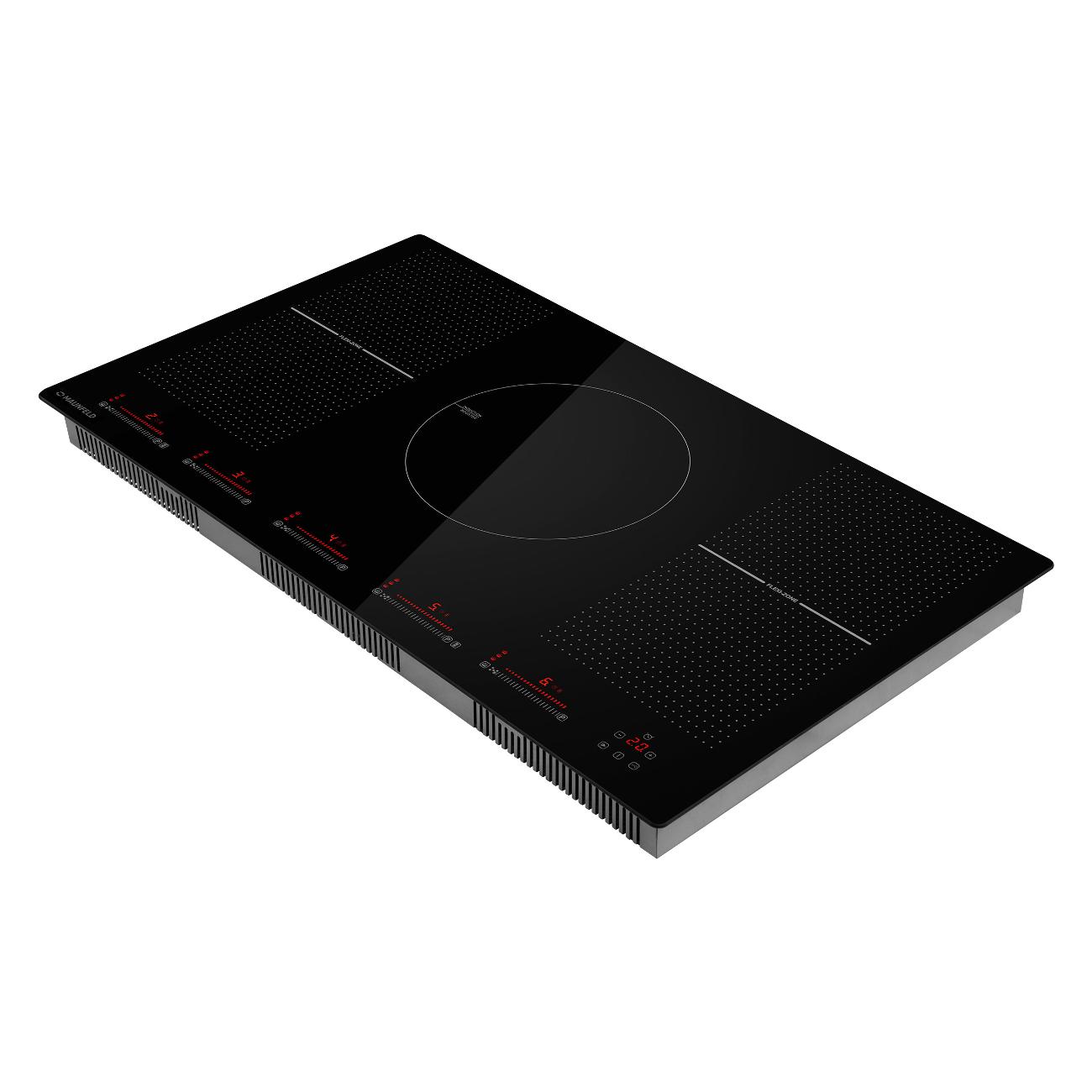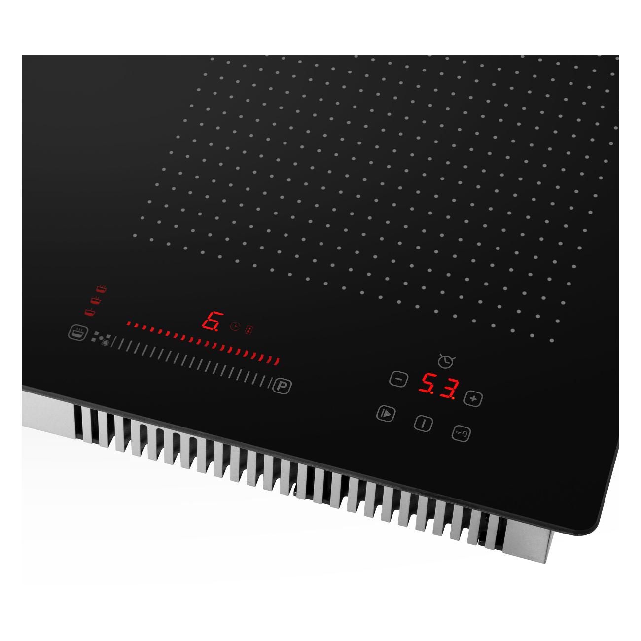Функция блокировки защищает от случайного нажатия кнопок. Технология непрерывного нагрева позволяет поддерживать точную температуру все время приготовления. Панель снабжена тремя режимами работы, в том числе возможностью разморозки и подогрева пищи. Работу прибора можно приостановить и возобновить одним касанием. У панели есть защита от перегрева, неправильного подключения и проливания воды. Мощность прибора составляет 9000 Вт.