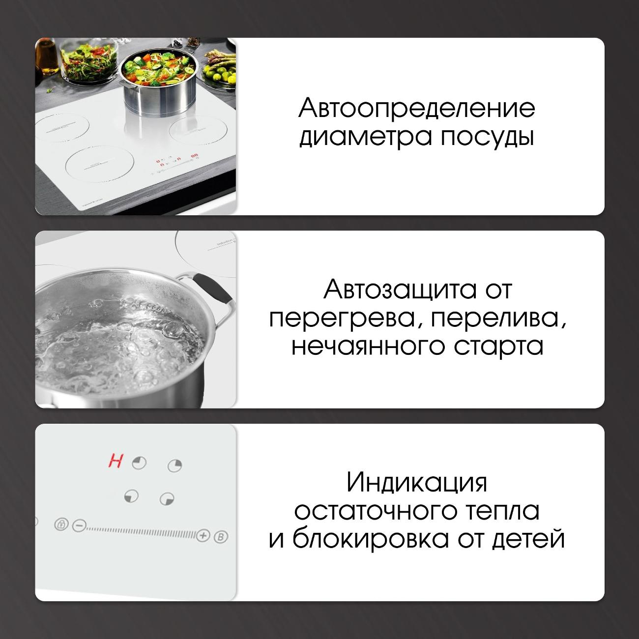 Сенсор определяет наличие посуды, отслеживает процесс закипания, что в совокупности с автоотключением при переливе жидкости и возможностью блокировки кнопок повышает безопасность эксплуатации. Зона нагрева устанавливается автоматически. О завершении работы электроприбор оповещает звуком. Стеклокерамическая варочная поверхность не боится перепадов влажности, температуры, не покрывается трещинами и сколами от ударных и механических нагрузок. Вес — 8,75 кг, габариты — 590х520 мм.