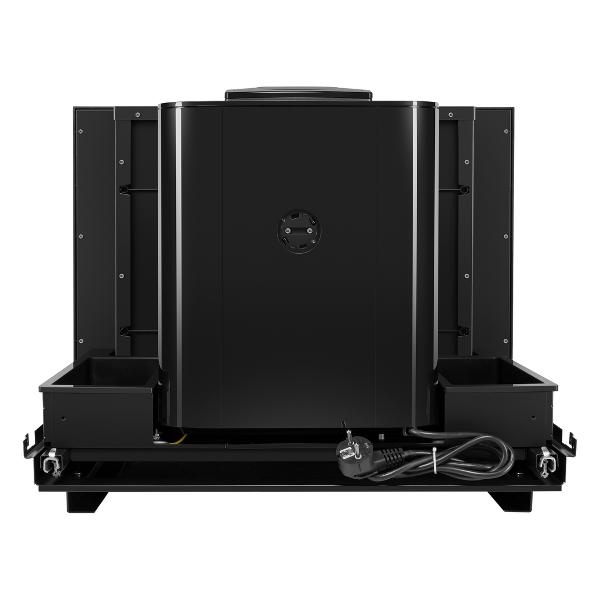 Корпус кофемашины сделан из металла. Он покрыт специальным составом, на котором не остаются отпечатки пальцев. Фронтальная панель стеклянная. Прибор оснащен встроенной кофемолкой. Степень измельчения зерен можно регулировать. Чашки подсвечиваются. На фронтальной панели кофемашины находится LED-дисплей. Присутствует индикация текущего уровня воды, этапа приготовления напитка, отсутствия кофе или воды, перегрева, заполнения резервуара для капель и отсека для отходов. Кофемашина оснащена встроенным таймером. По окончании приготовления напитка раздастся звуковой сигнал. Ресурс картриджа для очистки воды составляет 100000 л. В комплект входит мерная ложка. Энергопотребление кофемашины составляет 1500 Вт.