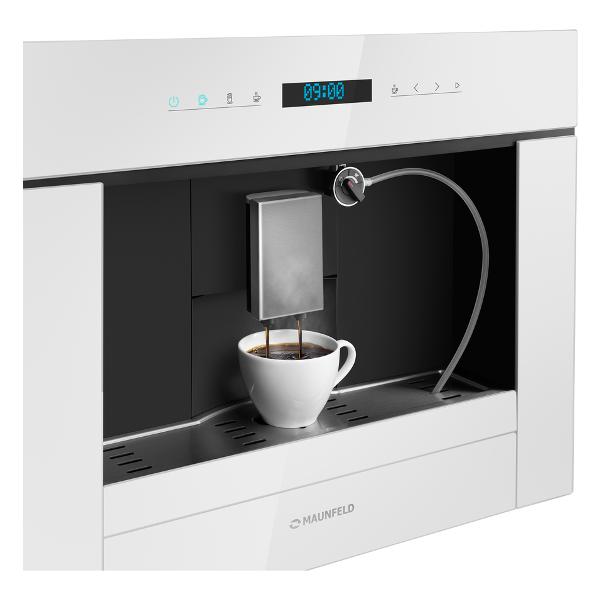 Встраиваемая кофемашина Maunfeld AMCM1503W в корпусе черно-белой расцветки способна приготовить различные виды кофе: капучино, эспрессо, латте, лунго, ристретто, флэт-уайт. На приготовление одной чашки уходит около 30 секунд. Также прибор может производить обычный кипяток. Модель совместима с кофе в зернах и молотым. Присутствует возможность выбора объема: малой, средней и большой чашки. Модель оснащена капучинатором, который превращает молоко в нежную пенку. Ее плотность регулируется. Крепость и температуру готового кофейного напитка также можно настраивать.