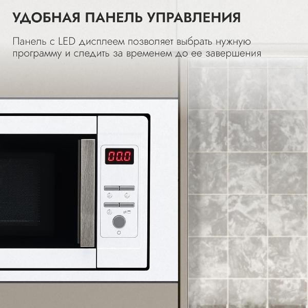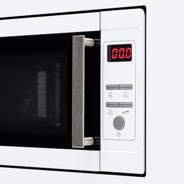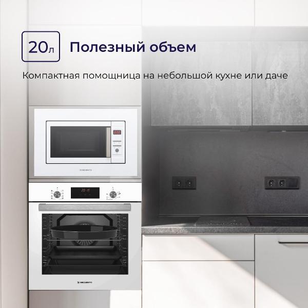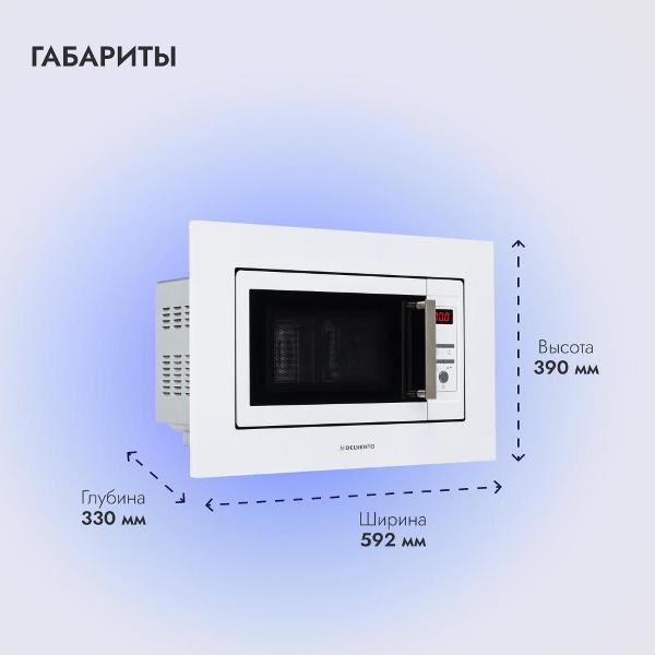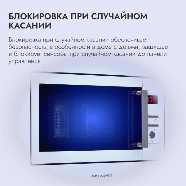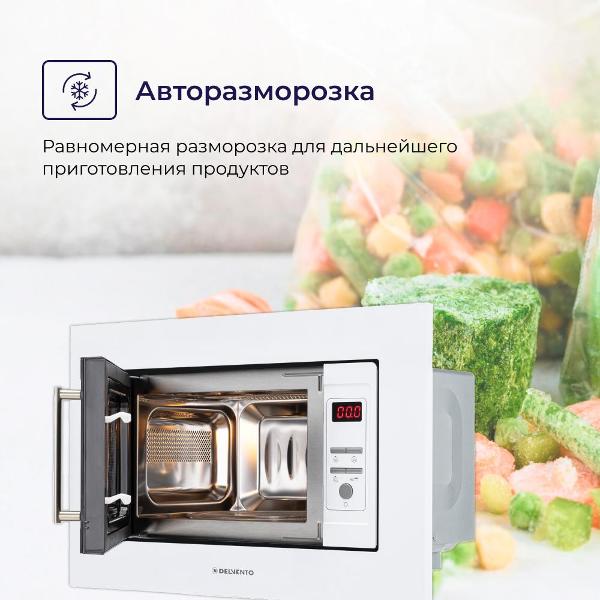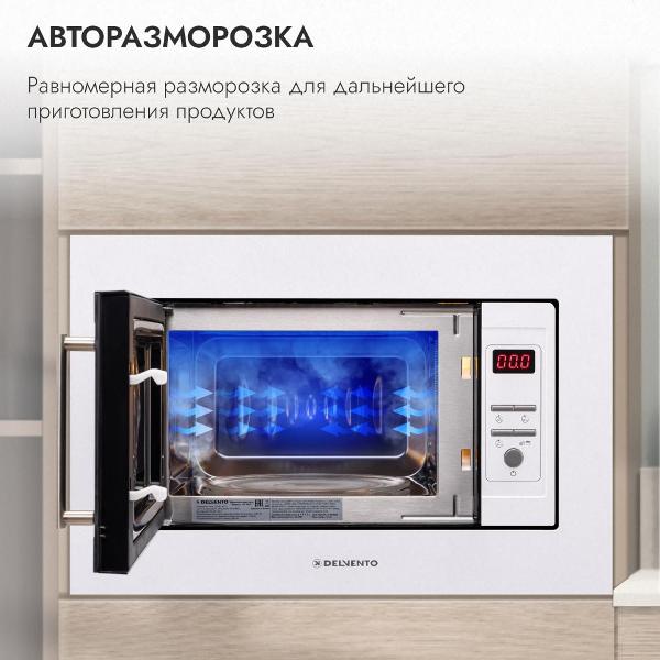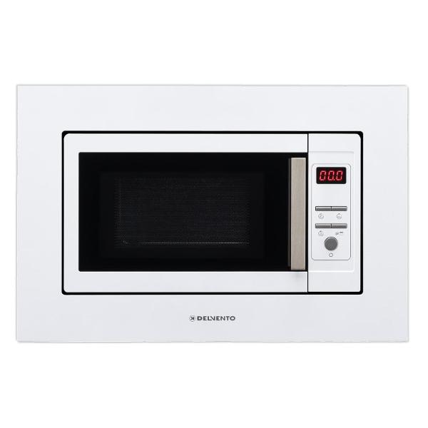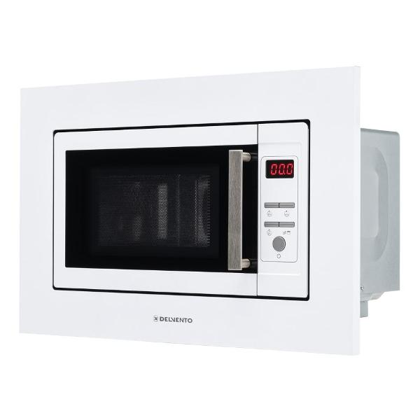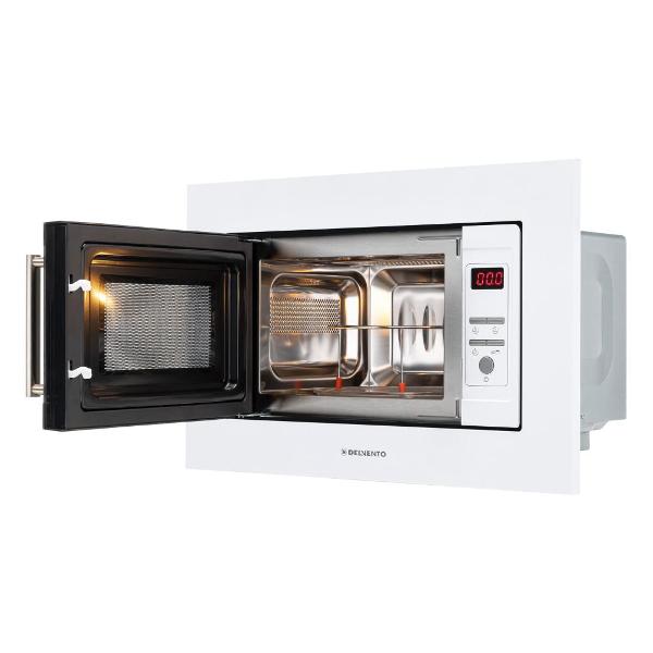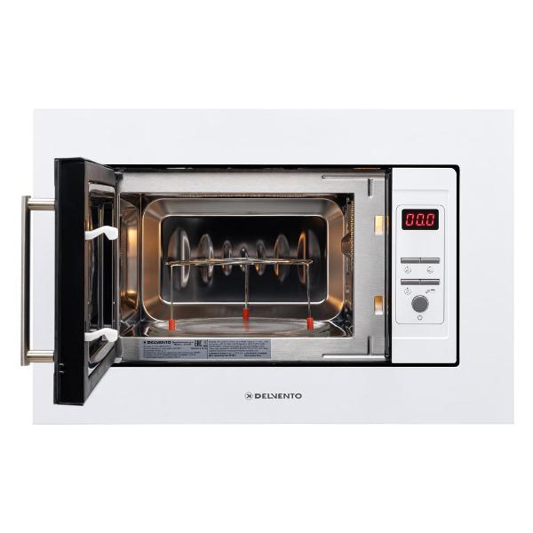 Встраиваемая микроволновая печь Delvento DV 2010 белого цвета предназначена для установки в кухонную мебель. Фронтальная панель выполнена из эмалированной стали и двухслойного стекла. Дверь открывается налево с помощью клавиши. Объем камеры — 20 л, диаметр поворотного блюда — 24,5 см.