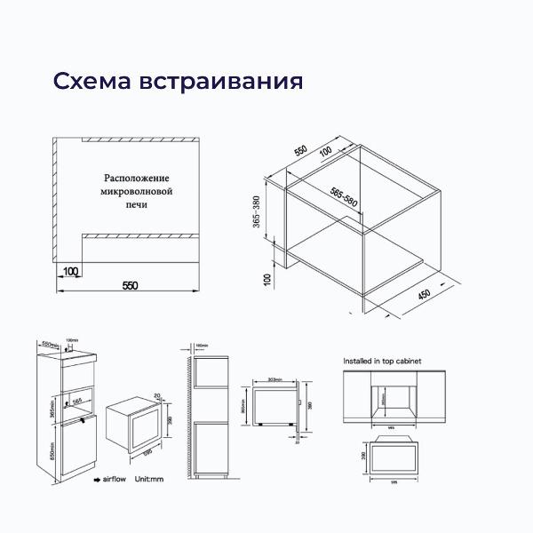 Внутреннее пространство ярко освещает галогеновая лампа. Устройство укомплектовано высокой металлической решеткой для гриля. Габариты микроволновой печи — 37,6х59,2х33 см, вес — 12,5 кг. Для монтажа используется ниша размером 36,5х56,5х55 см.