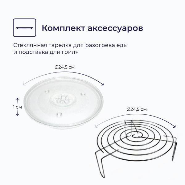 В прибор заложены режимы «Гриль», «Микроволны», «Автоматическое размораживание» и «Размораживание по весу». Мощность СВЧ регулируется на пяти уровнях, предусмотрена функция остановки и возобновления приготовления. Встроен блокиратор, предохраняющий от случайного запуска. Управление обеспечивают механические переключатели. Данные отображаются на дисплее. Можно запрограммировать таймер со звуковым сигналом.