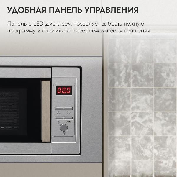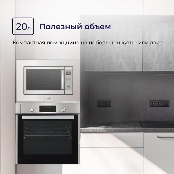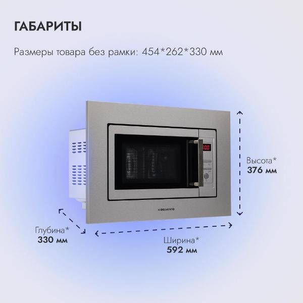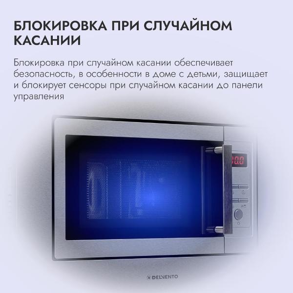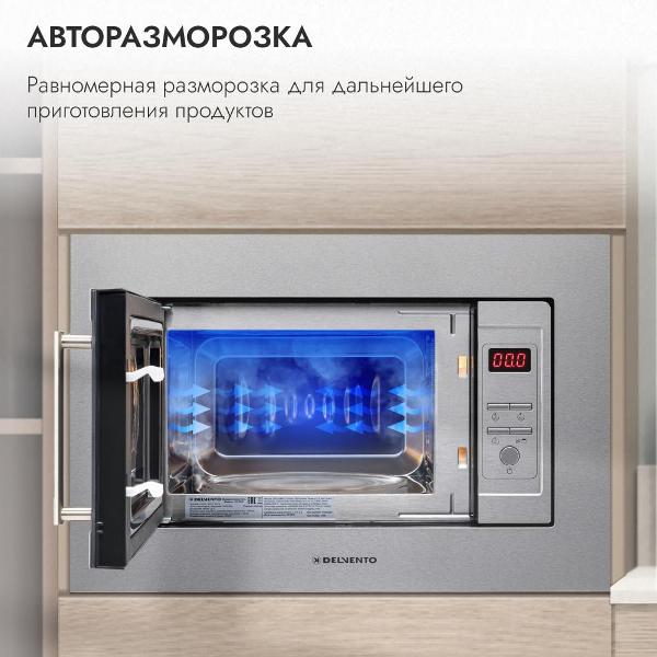 Встраиваемая микроволновая печь Delvento DV 2012 серого цвета предназначена для установки в кухонную мебель. Фронтальная панель выполнена из эмалированной стали и двухслойного стекла. Дверь открывается налево с помощью клавиши. Объем камеры — 20 л, диаметр поворотного блюда — 24,5 см.