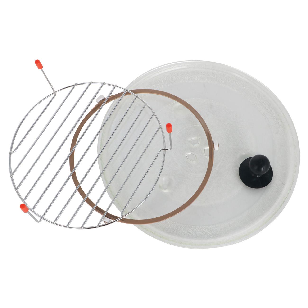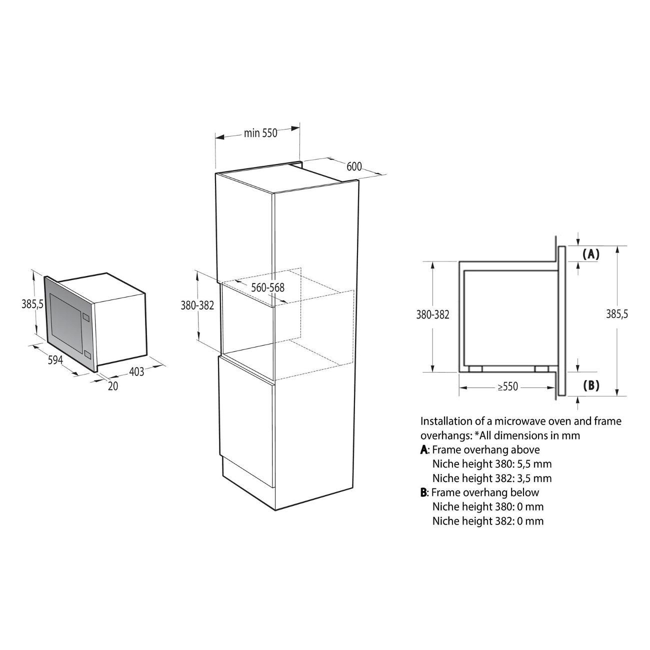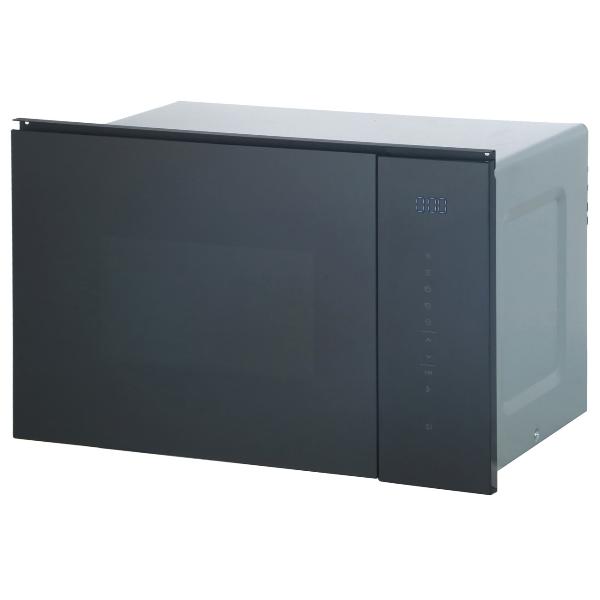 В качестве материала для фронтальной панели выбраны металл и стекло, для внутреннего покрытия — нержавеющая сталь, для поворотного стола диаметром 31,5 см — стекло. Дверца открывается налево электронным способом. Устройство с защитой от детей произведено в черном цвете и весит 17,6 кг. При габаритах 386х594х403 мм устанавливается в нишу размером 380х560х550 мм. В комплекте находятся рамка для встраивания, металлическая и низкая решетки.