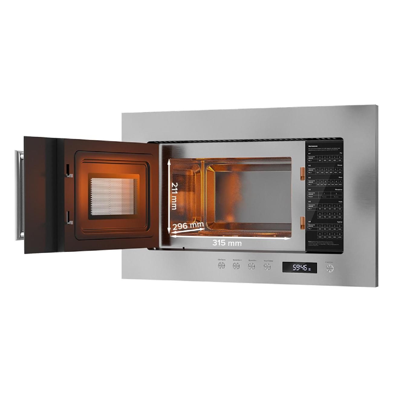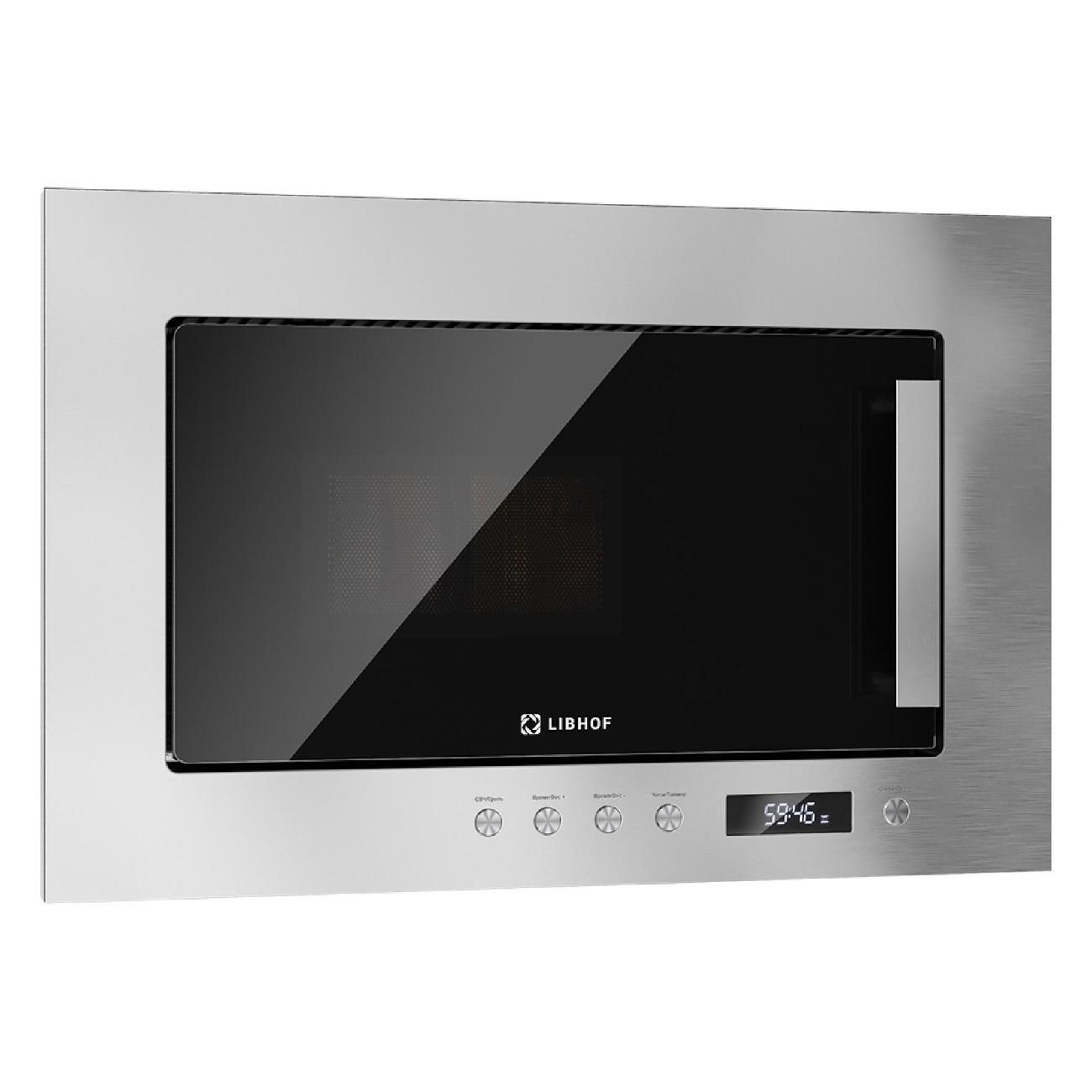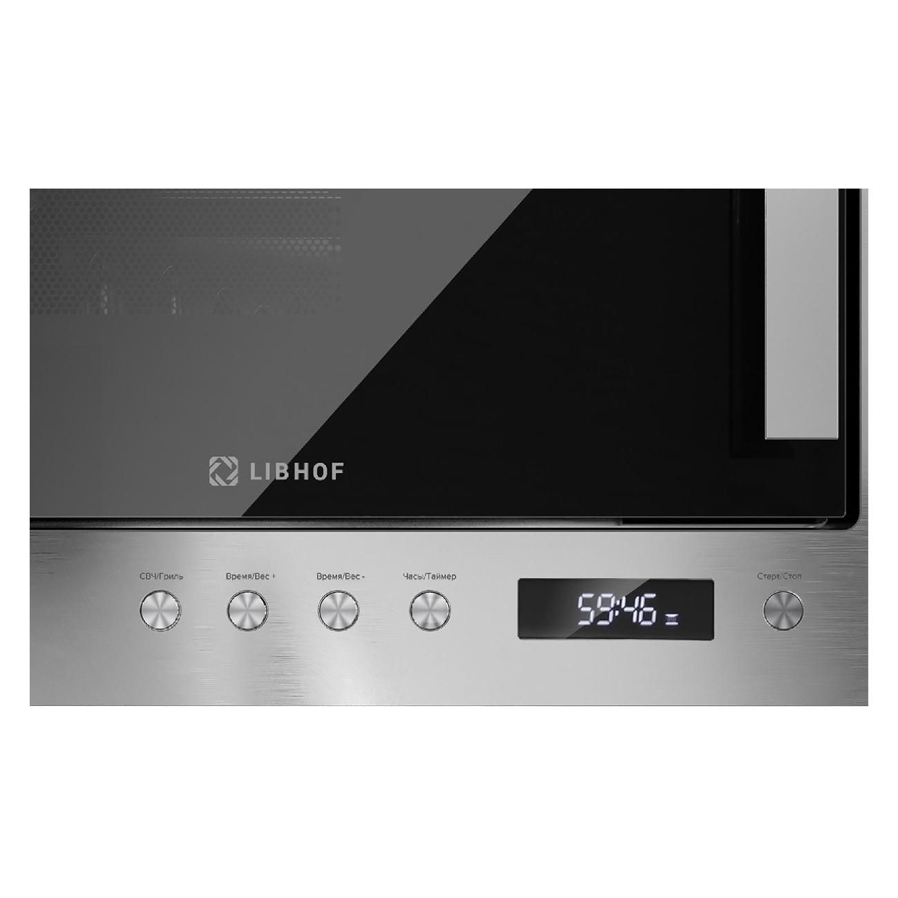 Встраиваемая микроволновая печь Libhof MWB-5120S с объемом рабочей области 20 л оборудована небольшим цифровым дисплеем, на который выводятся часы и отображается оставшееся время до конца готовки. Рабочая область выполнена из нержавеющей стали, легко поддающейся чистке. Тип управления — кнопочный. Доступно шесть автоматических программ приготовления блюд и режим размораживания. Предельный показатель потребляемой мощности равен 700 Вт.
