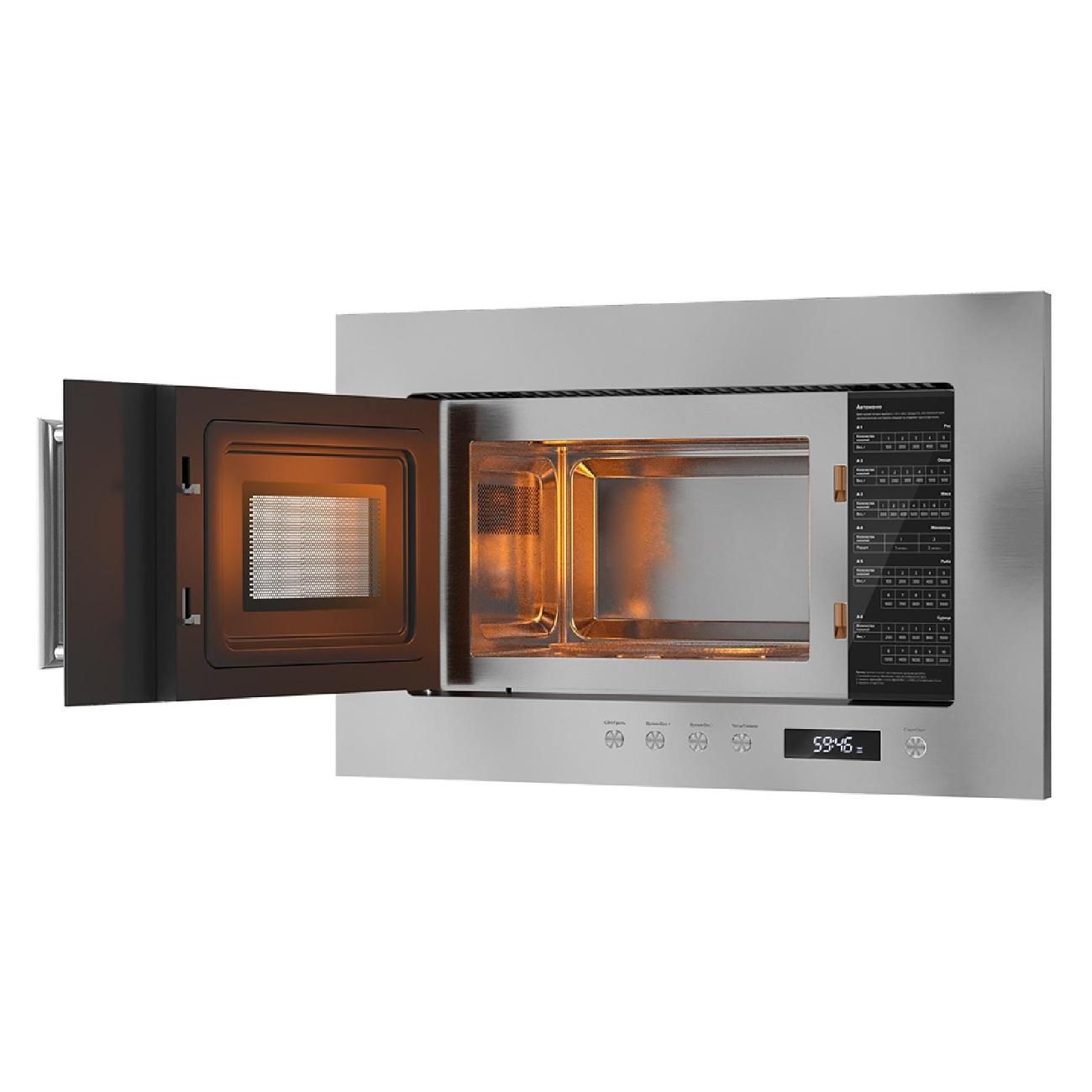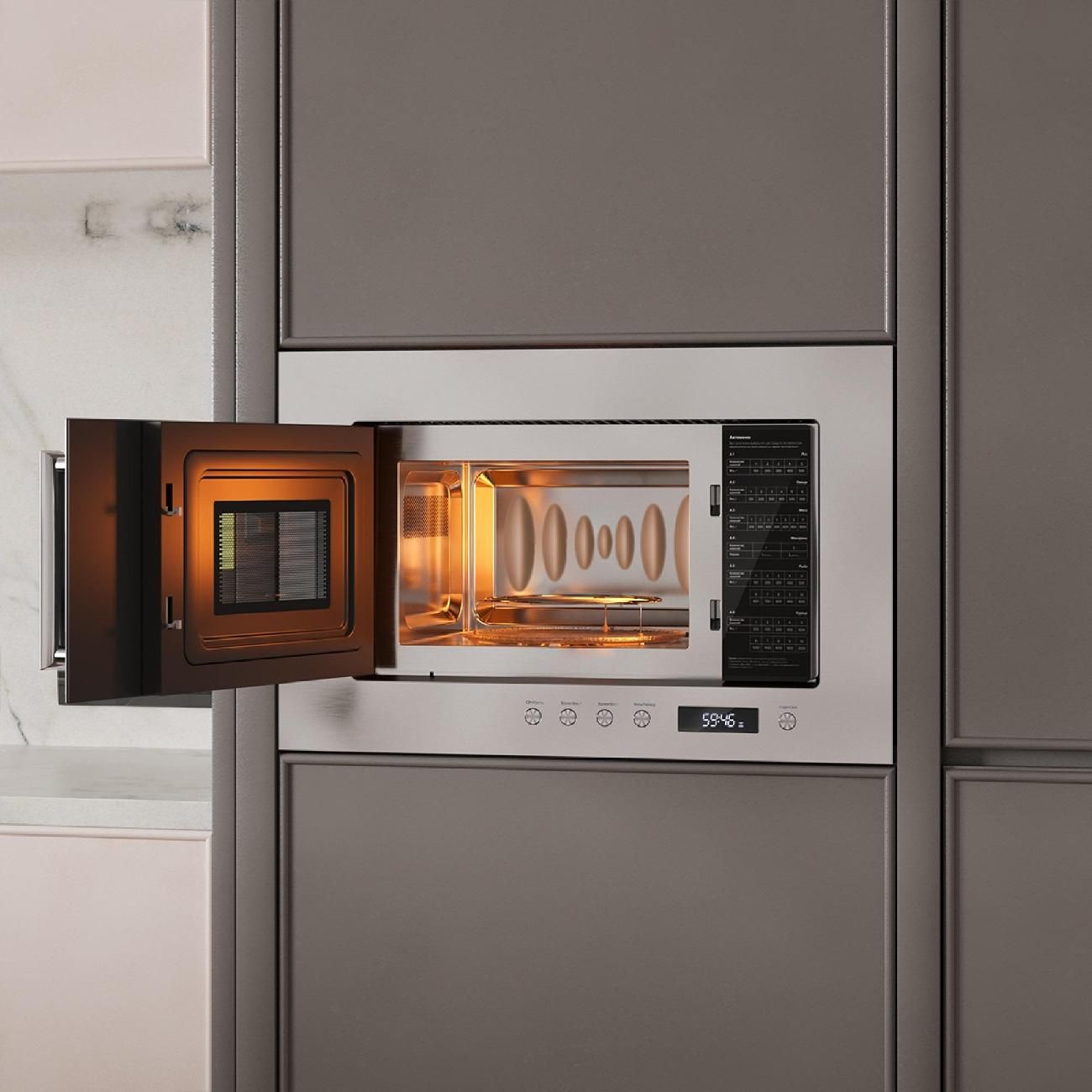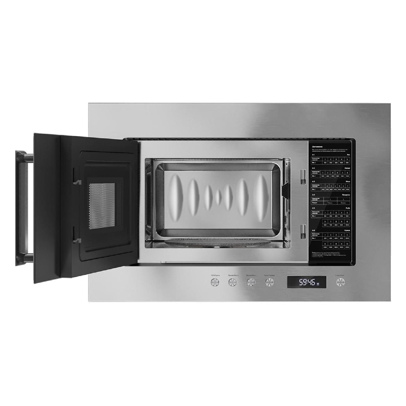 Встраиваемая микроволновая печь Libhof MWB-5120S с объемом рабочей области 20 л оборудована небольшим цифровым дисплеем, на который выводятся часы и отображается оставшееся время до конца готовки. Рабочая область выполнена из нержавеющей стали, легко поддающейся чистке. Тип управления — кнопочный. Доступно шесть автоматических программ приготовления блюд и режим размораживания. Предельный показатель потребляемой мощности равен 700 Вт.